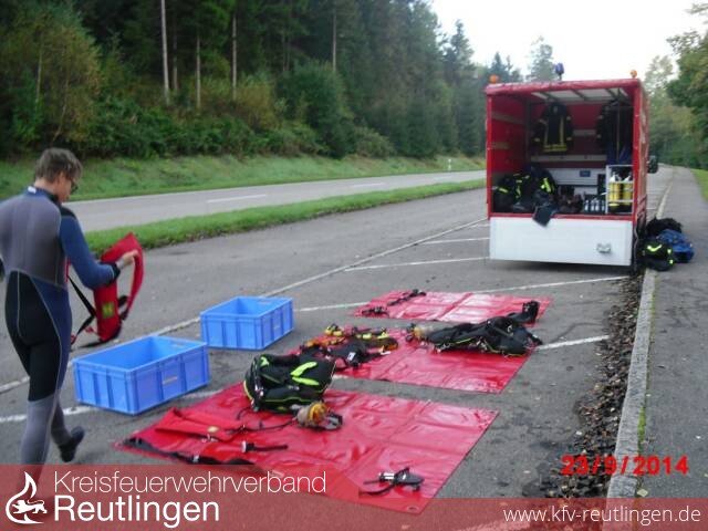Um den Anforderungen im Tauchwesen bei der Rettung von Personen gewachsen zu sein, haben sich 11 Feuerwehrtaucher der Feuerwehren Reutlingen und Tübingen an der Nagoldtalsperre im Landkreis Freudenstadt weitergebildet. Dort wo andere Urlaub machen, stand für die Feuerwehrtaucher an zwei Tagen Tieftauchen, Tarierübungen und Notfalltraining, beispielsweise bei Kommunikationsunterbrechungen oder festhängenden Signalleinen auf dem Programm.