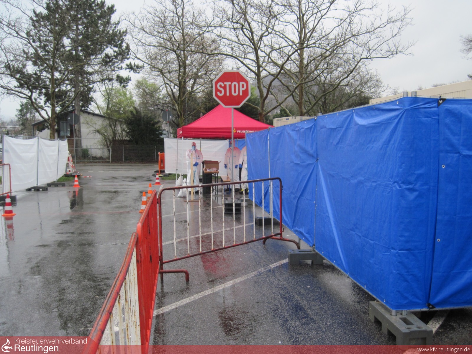 Auch unterstützt unsere Spezialeinheit – die Gefahrstoffeinheit – seit vergangenem Donnerstag täglich das Landratsamt Reutlingen, zunächst beim Aufbau und der Einrichtung, und jetzt auch beim Betrieb eines Corona - Abstrichzentrums an der Kreuzeiche.