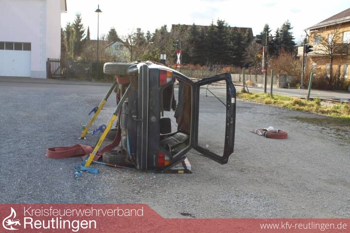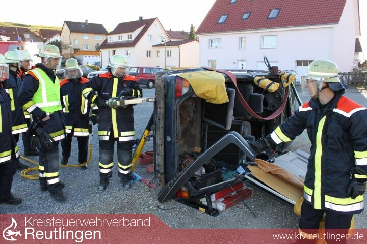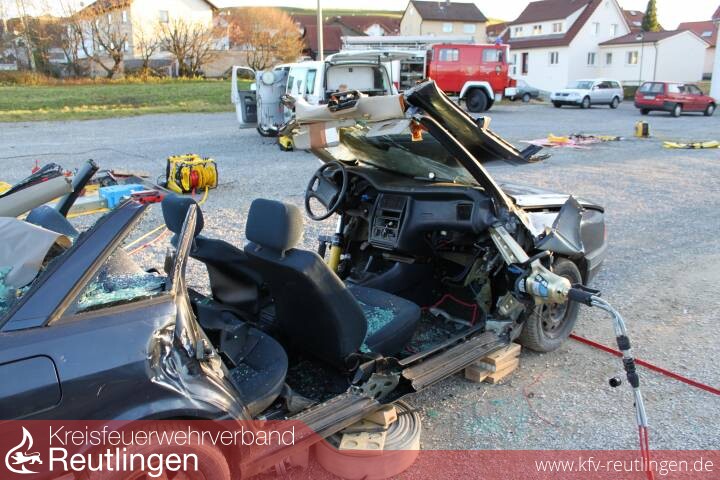 So stand am Vormittag zunächst im Gerätehaus in Großengstingen eine theoretische Unterweisung auf dem Programm. Neben verschiedenen Schnitt- u. Rettungstechniken wurden auch die vielen unterschiedlichen passiven Sicherheitssysteme (Airbag, Seitenaufprallschutz, etc) sowie neue Werkstoffe im Automobilbau besprochen. Sowohl die Erläuterungen zu den Gefahren bei neuen Antriebsarten (z.B. Gas-, Elektroantrieb), als auch die Nutzung von Cecklisten wurden begeistert von den anwesenden Personen angenommen.