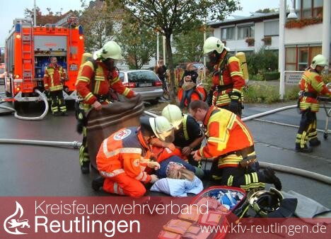 Hier können sie ausharren, bis sie über eine Drehleiter in Sicherheit gebracht werden. Vor dem Gebäude werden alle von der DRK-Bereitschaft versorgt. Alle Hände voll zu tun haben die Sanitäter auch mit verwirrten und unter Schock stehenden Heimbewohnern, die noch lange nach Abschluss der Rettungs- und Löschaktion vor dem Samariterstift herumirren. Sehr überzeugend gespielt von den Mitgliedern der Realistischen Unfalldarstellung des Kreisverbands Reutlingen.