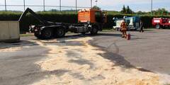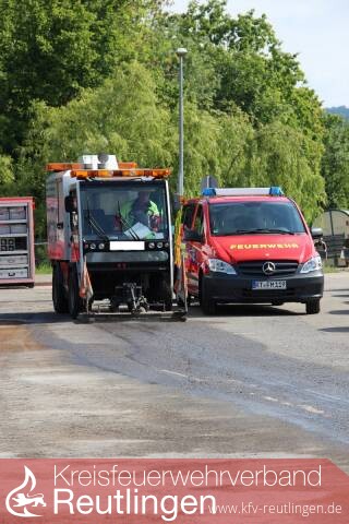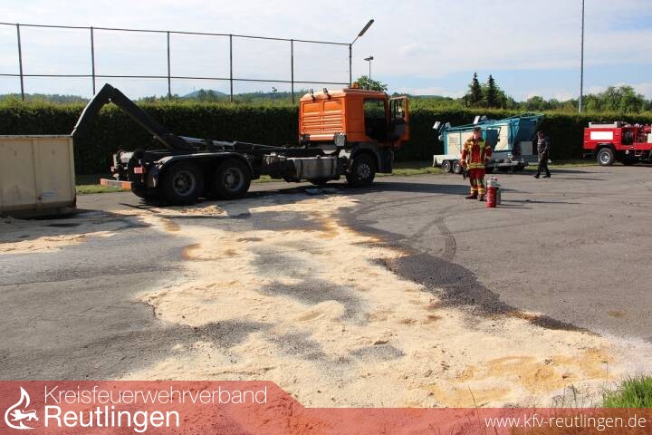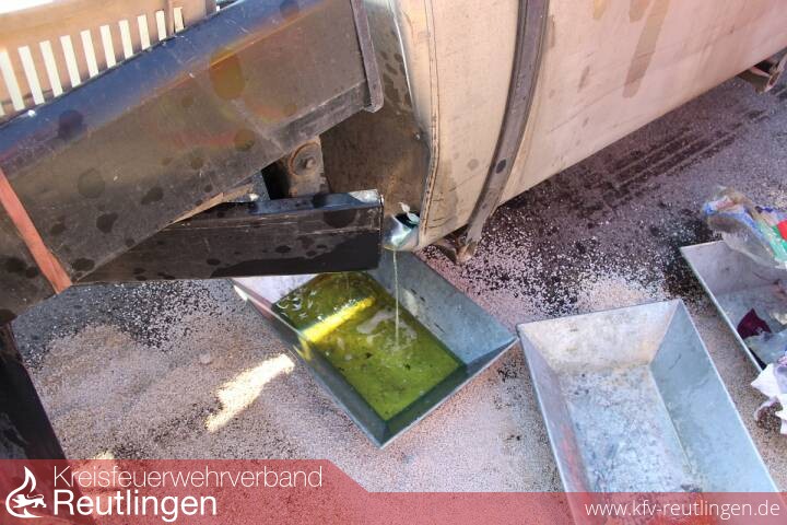 Am Samstagvormittag rangierten mehrere Lastkraftwagen eines Schaustellerbetriebes auf dem Parkplatz beim Festplatz Bongertwasen. Dabei riss an einem Wechselladerfahrzeug der Dieseltank auf und es traten etwa 300 Liter Dieselkraftstoff auf die Parkplatz- und Grünfläche aus. Die Leitstelle in Reutlingen alarmierte daraufhin die Feuerwehr Metzingen, die mit einem Gefahrstoffzug anrückte. Die Erstmaßnahmen der Feuerwehr konzentrierten sich darauf, den leckgeschlagenen Fahrzeugtank notdürftig zu verschließen und den ausgelaufenen Betriebsstoff, der in das Erdreich versickert, mit Ölbindemittel zu binden. Danach wurde der gesamte Parkplatzbereich ebenfalls mit Ölbindemittel abgestreut und der Dieselkraftstoff somit gebunden. Nach Rücksprache mit Vertretern der Stadt Metzingen, der Polizei und dem Umweltamt wurde von einer Reinigungsfirma das verunreinigte Erdreich großflächig abgetragen und der Parkplatz mit einer Spezialmaschine gereinigt.