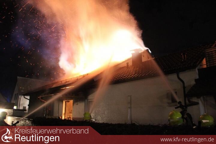 Beim Eintreffen der Metzinger Feuerwehr rund sechs Minuten nach Eingang der Alarmmeldung, stand das gesamte Gebäude lichterloh in Flammen. Nach der Versorgung des verletzten Mannes leitete die Wehr eine umfassende Brandbekämpfung von mehreren Seiten ein. Um die Flammen von oben bekämpfen zu können, kam die Drehleiter zum Einsatz. In der Anfangsphase bestand die Gefahr, dass das Feuer auf andere Gebäude übergreift. Ein angrenzendes Wohnhaus wurde zur Evakuierung von der Feuerwehr gewaltsam geöffnet, nachdem in einem Zimmer Licht brannte. Es konnte nicht ausgeschlossen werden, dass sich Personen in akuter Gefahr befanden. Die Bewohner waren jedoch nicht anwesend.