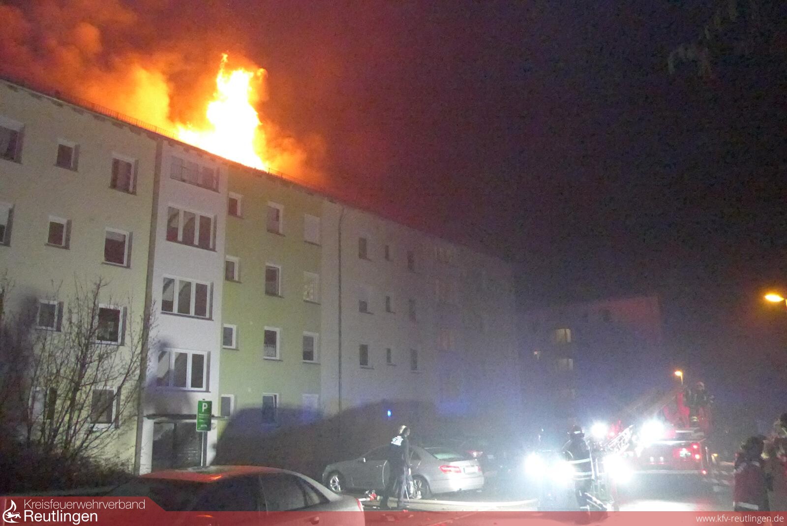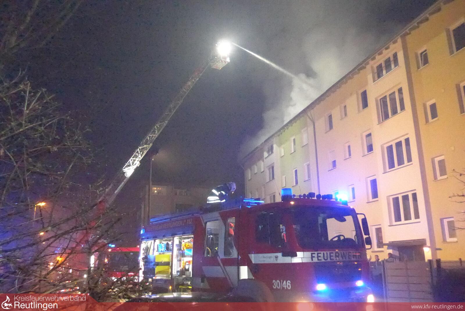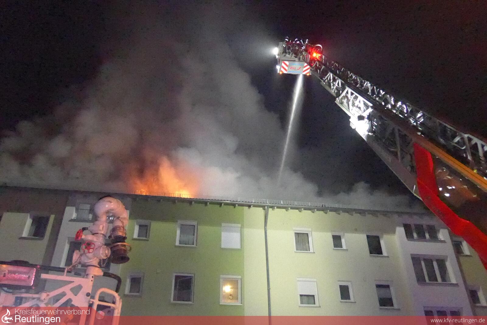 Nach einem relativ ruhigen Jahreswechsel folgte für die Reutlinger Feuerwehr um 03.20 Uhr der erste Großeinsatz des Jahres 2019. In der Sebastian-Kneipp-Straße 47 brannte ein Dachstuhl in einem 4-geschossigen Wohngebäude in voller Ausdehnung. Die Flammen schlugen beim Eintreffen der Feuerwehr rund 5 m hoch aus dem Gebäude. Verletzt wurde niemand.