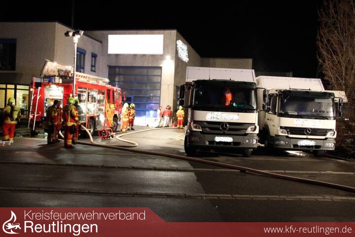 Gegen 23.30 Uhr war der Notruf bei der Leitstelle für Feuerwehr und Rettungsdienst in Reutlingen eingegangen, dass in der Carl-Zeiss-Straße in Metzingen Rauch aus einem dort abgestellten Lastwagen aufsteigen würde. Als die Metzinger Feuerwehr mit einem Löschfahrzeug kurze Zeit später eintraf, schlugen bereits Flammen aus einer Lüftungsöffnung des Lasters. Weil die Gefahr bestand, dass der Brand auf weitere abgestellte Fahrzeuge übergreift, bildete die Feuerwehr zunächst eine so genannte Riegelstellung.