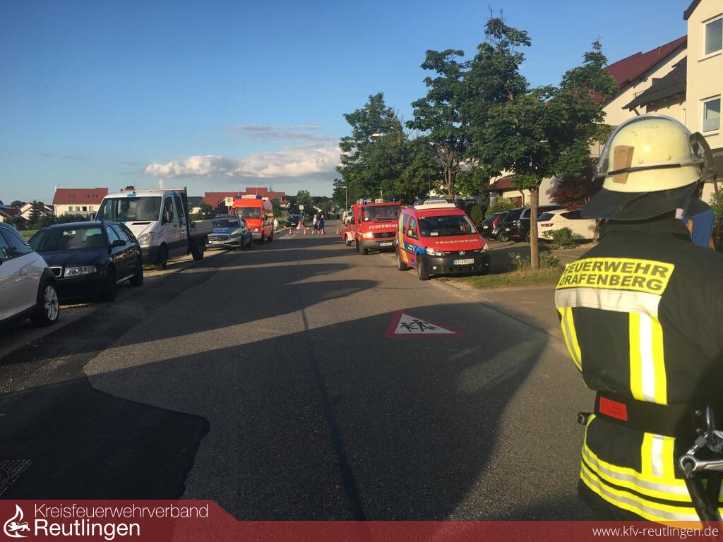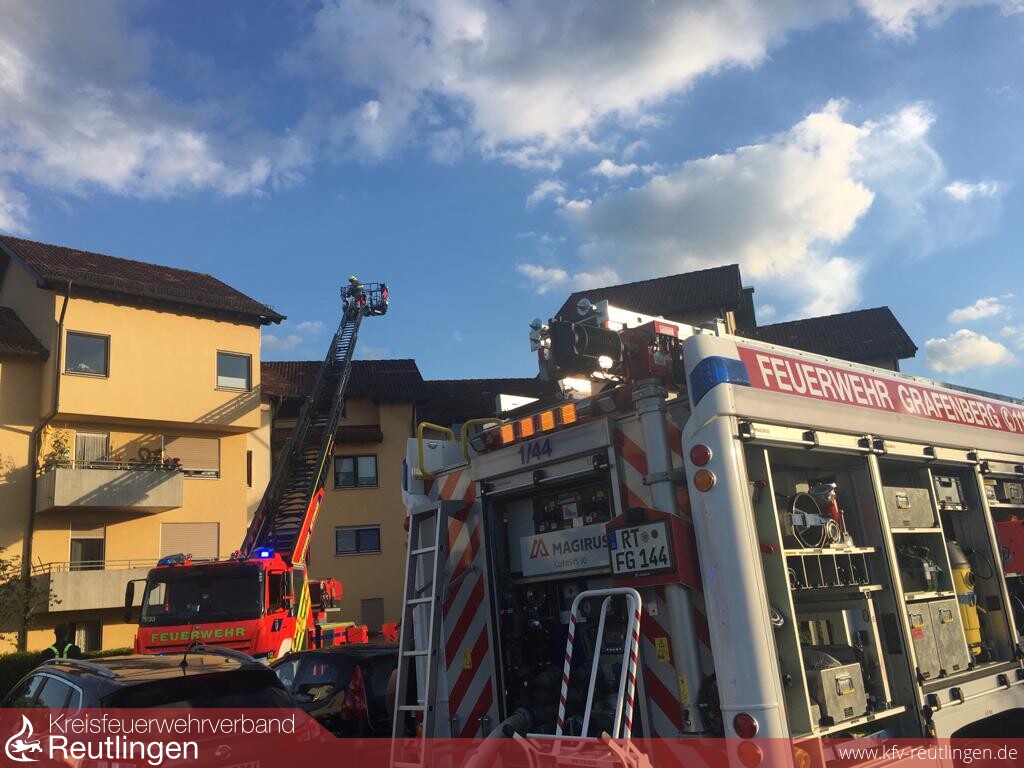 Zu einem Dehnfugenbrand wurden die Feuerwehren aus Grafenberg und Metzingen am Freitag, dem 10. Juni um 19.08 Uhr gerufen. In einer Wohnanlage in der Riedericherstraße wurden im Tagesverlauf Sanierungsarbeiten an einem Balkon durchgeführt. Vermutlich beim Schweißen wurde die Dehnfuge zwischen den beiden Gebäuden so stark erhitzt, dass sie später zu brennen begann. Nachdem deutlicher Brandgeruch wahrnehmbar und auch Rauch sichtbar war wurde von den Bewohnern die Feuerwehr gerufen. Die Dehnfuge musste in einem sehr zeitintensiven Einsatz geöffnet, abgelöscht, ausgeräumt und kontrolliert werden. Da der Brand bereits bis auf das Dach gezogen war wurde die Drehleiter der Feuerwehr Metzingen zur Unterstützung eingesetzt, um sicher an die Schadenstelle zu kommen. Die Feuerwehr Grafenberg war mit allen drei Fahrzeugen und 22 Kräften ebenso im Einsatz wie die Feuerwehr Metzingen mit drei Fahrzeugen und sieben Kräften. Weiter waren noch ein „Helfer vor Ort“ und die Polizei am Einsatz beteiligt. Auch Bürgermeister Brodbeck machte sich am Einsatzort ein Bild der Lage.