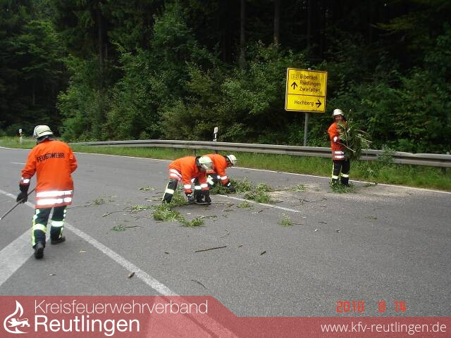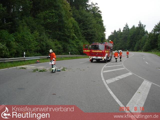 Ein Baum stürzte über die B312 in der Zwiefalter Steige. Verkehrsteilnehmer alarmierten die Feuerwehr zur Beseitigung. Der Baum lag über zwei Fahrspuren in Richtung Zwiefalten kurz vor der Abzweigung nach Hochberg. Die Freiwillige Feuerwehr Zwiefalten sperrte die B312 halbseitig und sicherte die Einsatzstelle ab. Der Verkehr wurde im Wechsel an der gesperrten Stelle vorbei geleitet.