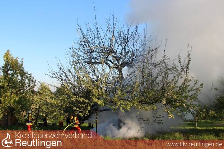 Am Morgen des 17. Aprils melden Autofahrer eine Rauchentwicklung im Bereich der Ulmer Straße. Daraufhin wurde die Feuerwehr Metzingen alarmiert. Beim Erkunden durch den Einsatzleiter stellte sich heraus, dass im Bereich des Gewanns Glore ein größeres Baumhaus in etwa 2 Meter Höhe in Vollbrand steht. Das Baumhaus wurde dann mit einem Trupp unter Atemschutz mit einem Löschrohr abgelöscht. Nach kurzer Zeit stürzte das Baumhaus in sich zusammen. Zur Sicherstellung der Wasserversorgung wurde ein Tanklöschfahrzeug zur Einsatzstelle nachgefordert. Die Nachlösch- und Aufräumarbeiten dauerten bis etwa 8:30 Uhr an. Dem Morgentau ist es zu verdanken, dass bei der aktuell sehr hohen Waldbrandgefahr die umliegenden Gräser und Büsche nicht auch noch gebrannt haben und das Schadenfeuer sich somit nicht vergrößern konnte . Die polizeiliche Ermittlung zur Brandurache nahm das Revier Metzingen auf.