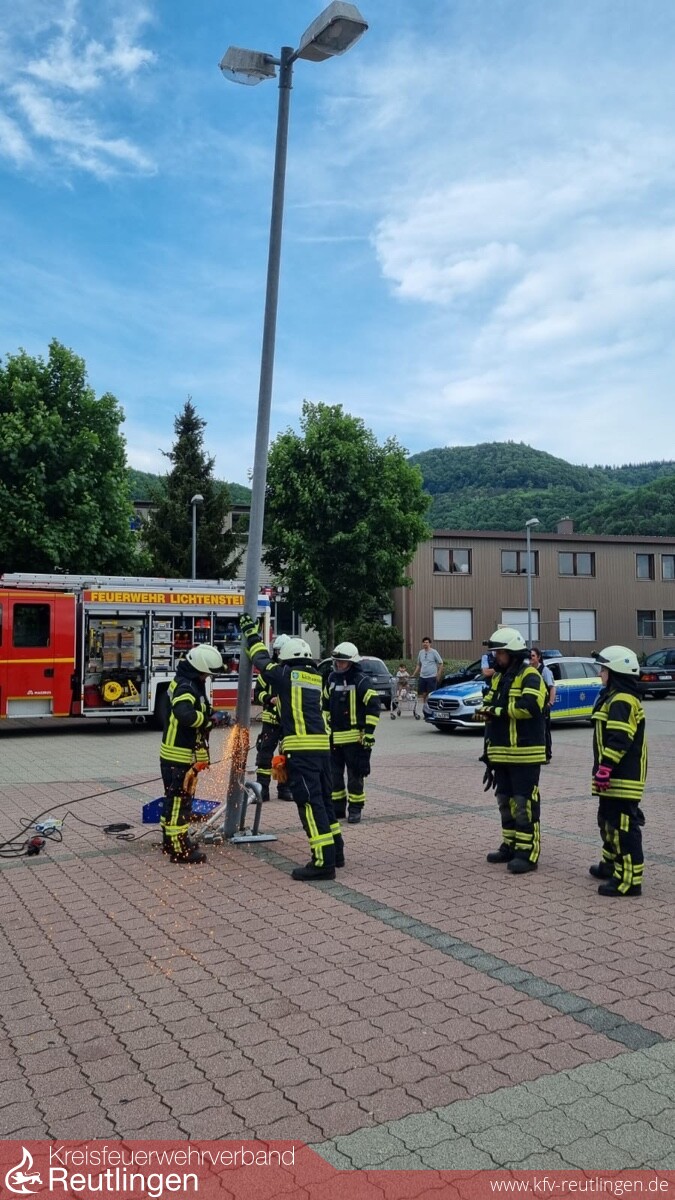 Aufgrund der Beschädigung an der Laterne, musste diese von der Feuerwehr mit einem einem Trennschleifer abgetrennt werden. Mit vor Ort war auch der örtliche Energieversorger, der die Laterne vom Netz getrennt hat.