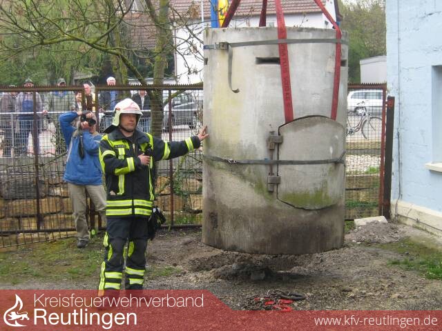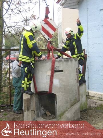 Den Betzinger Bunker an die Kralle zu bekommen, erwies sich für die Feuerwehrleute in mehrfacher Hinsicht als diffizil. Weil unmittelbar vor seinem Standort an der Echaz der alte Triebwerkkanal verläuft, der Aufbau dort also nicht sonderlich tragfähig ist, konnten sie mit ihrem schweren Kranwagen nicht direkt an den Bunker fahren. Je weiter aber der Winkel, desto weniger belastbar ist der Auslader. Normalerweise wäre die 4,5 bis 5 Tonnen wiegende Rarität kein Problem gewesen, jetzt aber sehr wohl. Millimeter um Millimeter tastete sich der Kran vor, hatte auch irgendwann das Bauwerk an der Angel. Und siehe da: Beim Abheben hing nicht etwa das ganze kleine Bunkerle dran, sondern nur der 1,5 Tonnen schwere Deckel. Lange Gesichter - nur nicht bei den Fachleuten. »Das ist Spitze, denn so verringert sich das Gewicht«, freute sich Rolf Götze.