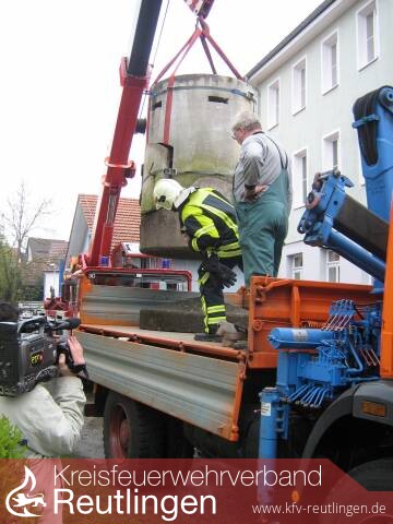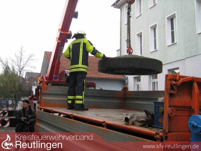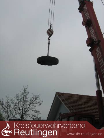 Ortsgeschichte - Außergewöhnliche Verladeaktion der Reutlinger Feuerwehr. Mit 30-Tonnen-Kran im Einsatz