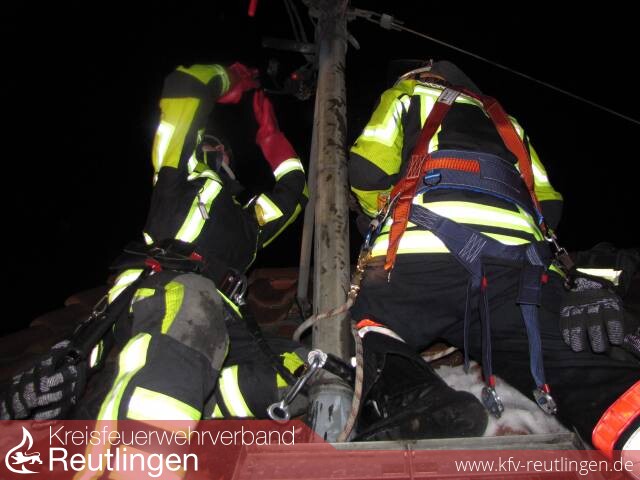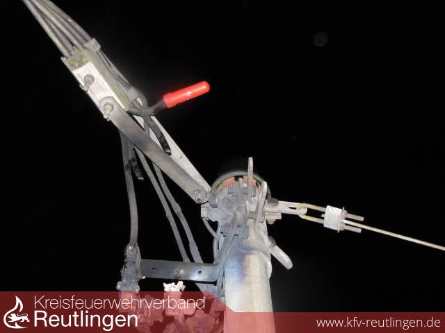 Zu einem gemeldeten Dachstuhlbrand - GAS 3, wurde die Feuerwehr Lichtenstein alarmiert. Die Einsatzstelle befand sich im Ortsteil Honau in der Schulstraße. Beim eintreffen der ersten Fahrzeuge konnte schnell festgestellt werden das an einem Dachständer der Netzverteiler brannte. Zur Sicherheit wurden die Bewohner aus dem Gebäude evakuiert. Die Abteilung Holzelfingen wurde in der Gallusstraße in Bereitstellung beordert und übernahm später den Brandschutz für eventuelle Folgeeinsätze. Da große Lichtbögen und Funken zu sehen waren, wurden an zwei Seiten des Hauses Riegelstellungen aufgebaut und das Dach überwacht. Desweiteren wurde ein Trupp im Dachgeschoss zur Sicherung des Gebäudeinneren eingesetzt. Da die Abt. Unterhausen einen Techniker der EnBW die für das Stromnetz Honau zuständig sind und einen der Fa. Rieger (Ortsnetz Unterhausen) in ihren Reihen haben konnten diese die Abschaltung des Netzes vornehmen, bevor der Reguläre Notdienst eintraf. Das Gebäude wurde nicht beschädigt. Zur Notreparatur wurde die Einsatzstelle für die EnBW ausgeleuchtet. Die Feuerwehr war mit 8 Fahrzeugen und 44 Mann vor Ort.