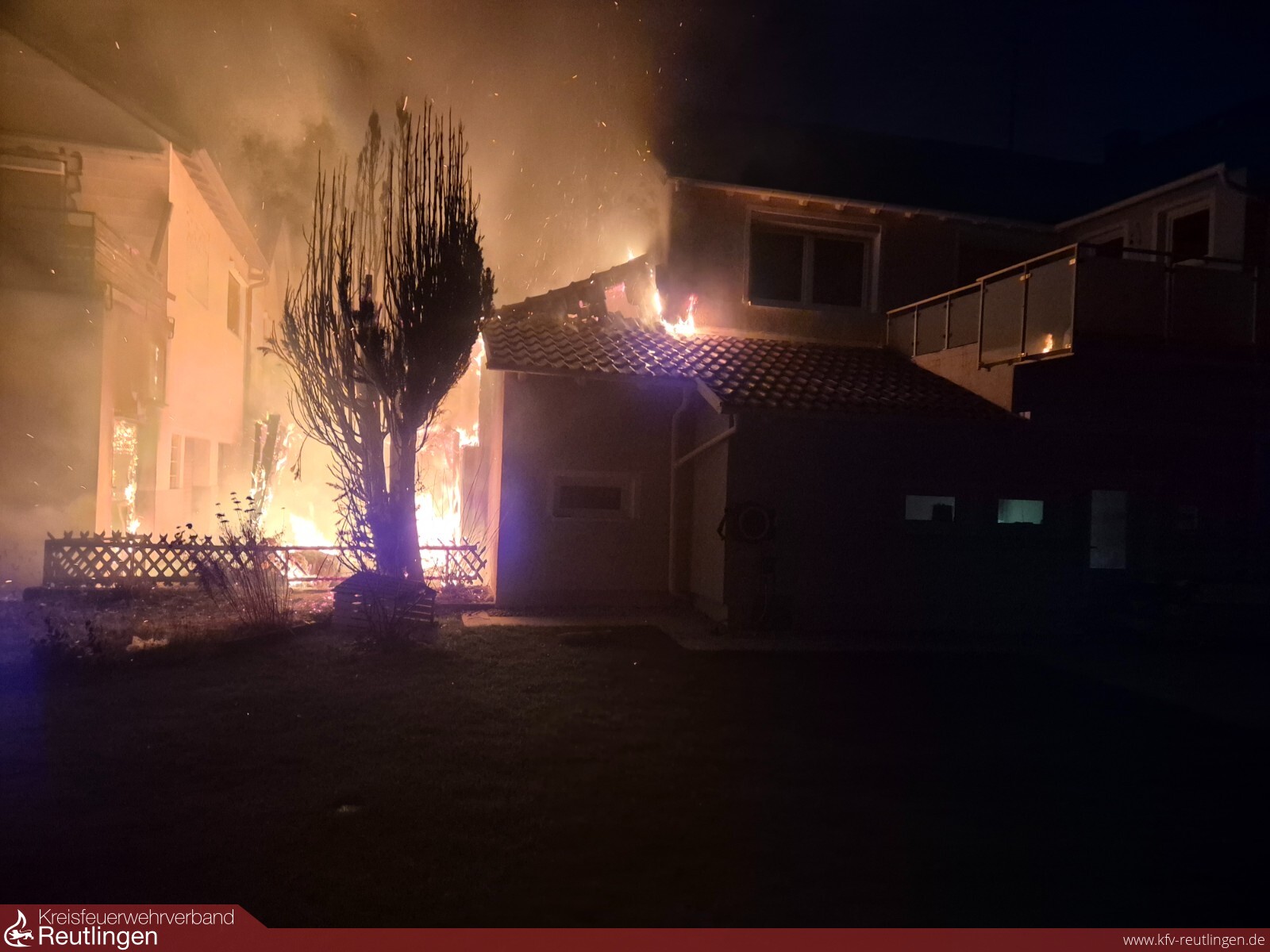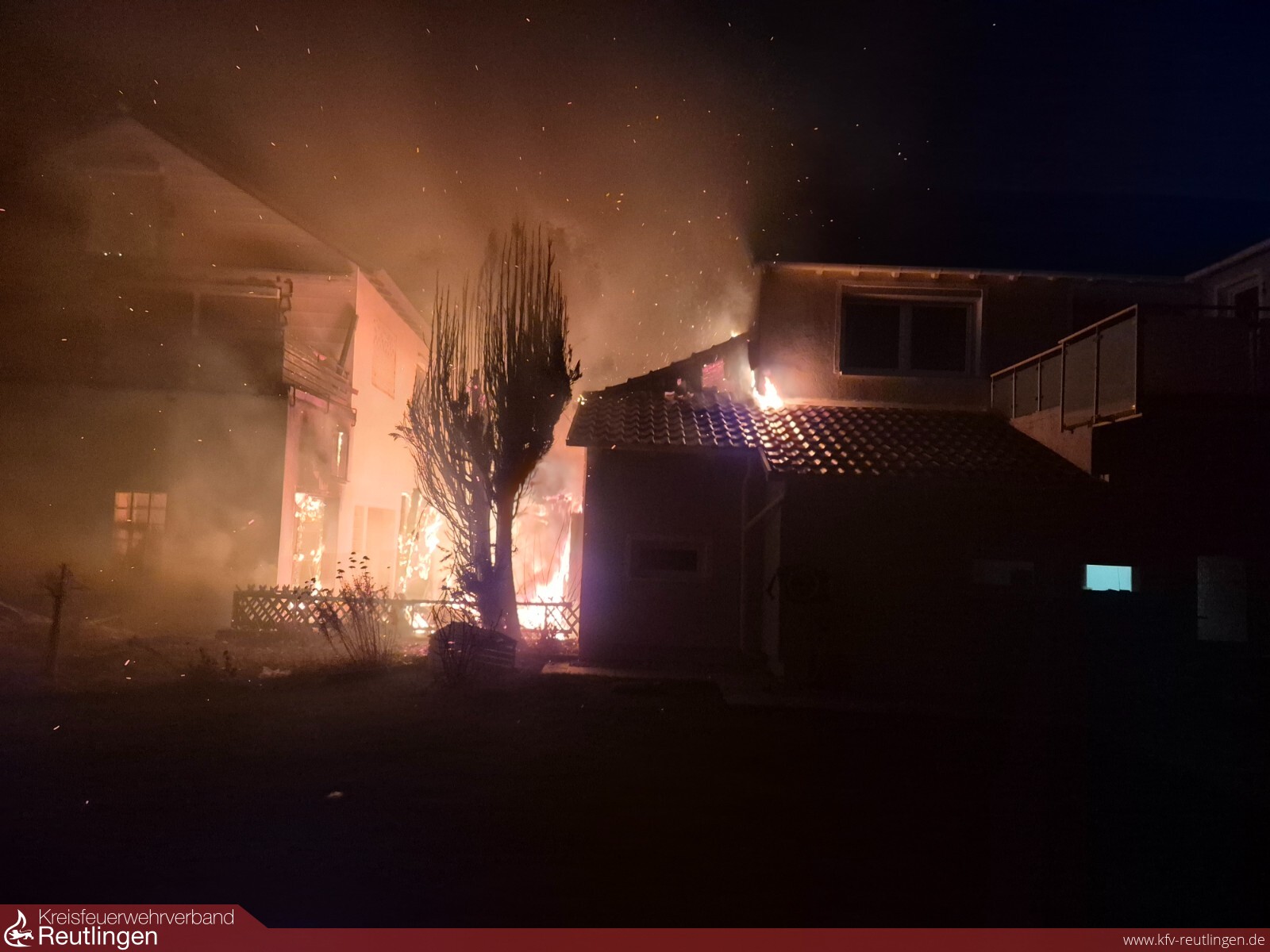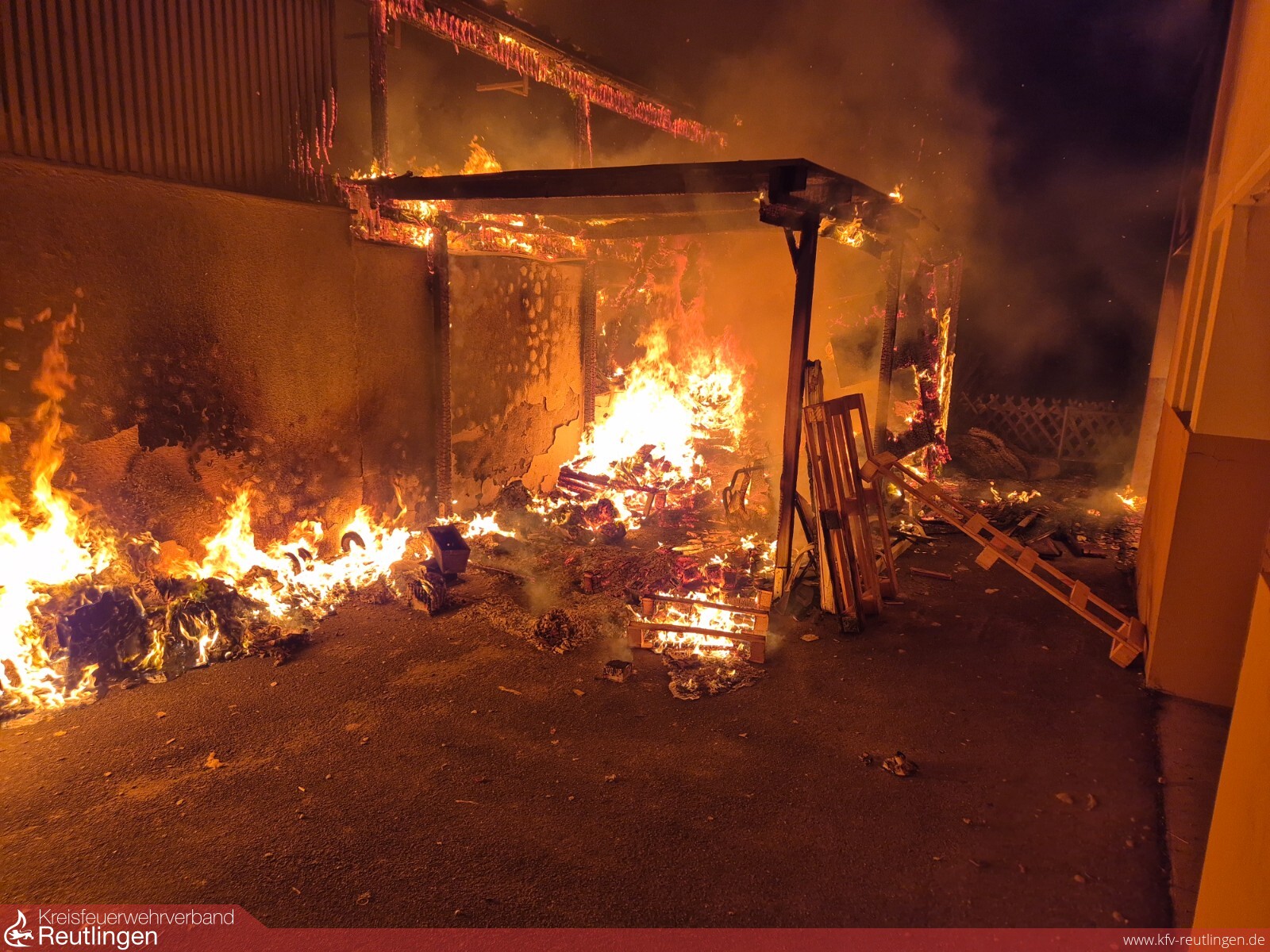 Zu einem Großeinsatz der Feuerwehr kam es am Neujahrsmorgen in der Schillerstraße. Gegen 07.00 Uhr brach an einem Carport ein Feuer aus, welches sich in der Folge auch zum Teil auf zwei angrenzende Wohngebäude ausbreitete. Im Carport brannte ein Motorrad vollends aus, zudem ist eine Einliegerwohnung aktuell nicht mehr bewohnbar. Die Feuerwehren aus Dettingen und Bad Urach, welche mit elf Fahrzeugen und 59 Einsatzkräften anrückten, konnten eine weitere Ausbreitung verhindern. Verletzt wurde glücklicherweise niemand. Vorsorglich kam jedoch der Rettungsdienst mit mehreren Fahrzeugen ebenfalls zur Einsatzstelle. Der Gesamtsachschaden beläuft sich auf circa 150.000 Euro. Das Polizeirevier Metzingen hat die weiteren Ermittlungen zur bislang unklaren Brandursache aufgenommen. (Quelle: PP Reutlingen)