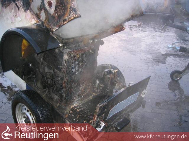 der in einem Werkgelände in der Carl - Benz Str. abgestellt war handelte. Mit einem Schnellangriff konnte der Brand rasch gelöscht werden. Es blieb aber nicht aus, das der Anhänger komplett ausbrannte. Ein daneben stehender Autoanhänger wurde beim Brand noch in Mitleidenschaft gezogen. Der Schaden wird auf mehrere Hundert Euro geschätzt. Die Ursache des Brandes ist ein technischer Defekt am Gerät.