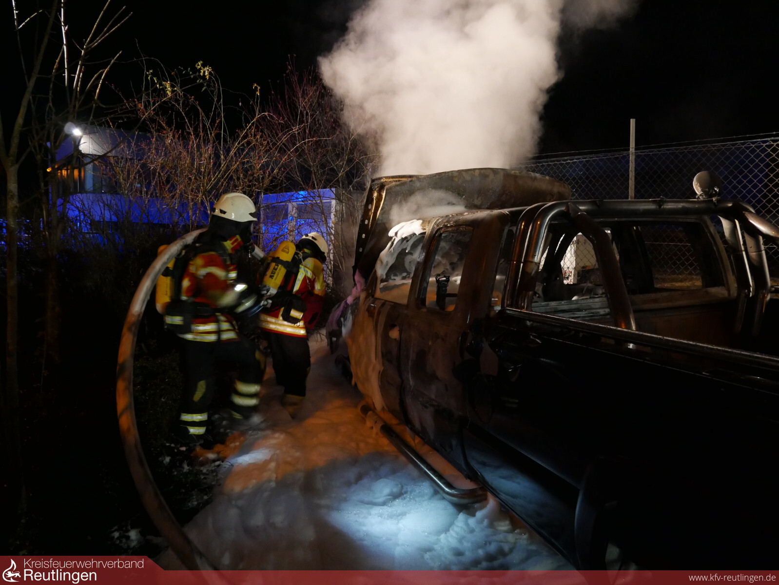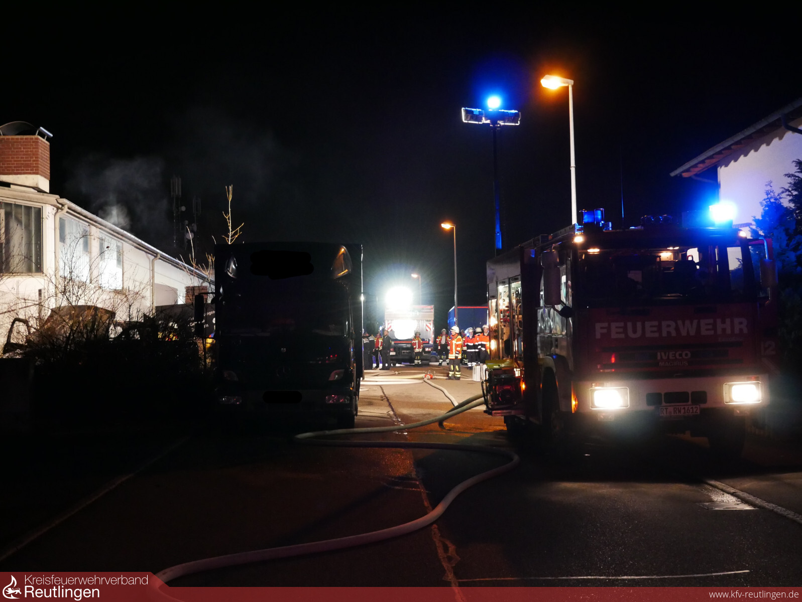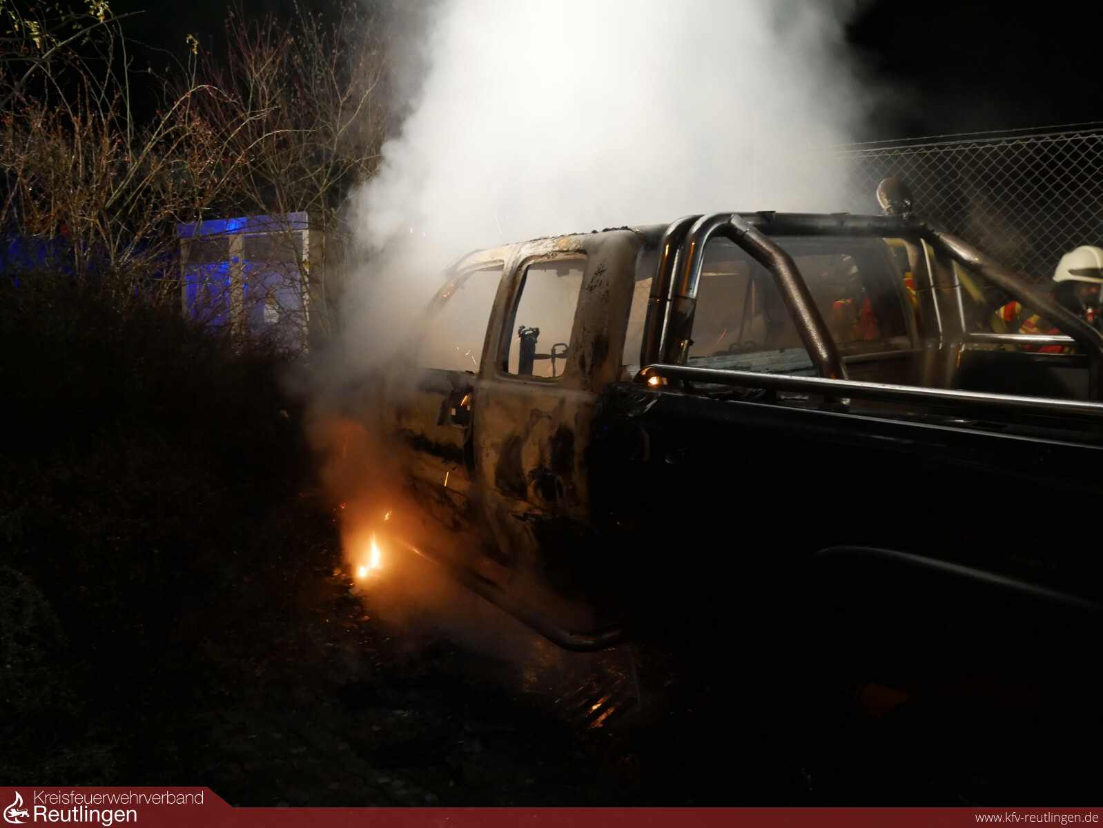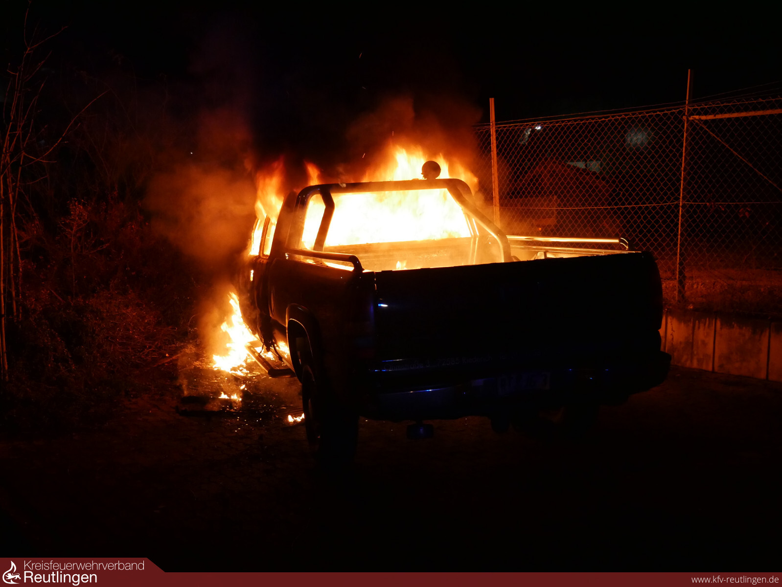 Zu einem brennendem Lkw sind am Freitag, gegen 1.15 Uhr, die Einsatzkräfte der Feuerwehr und der Polizei in das Riedericher Industriegebiet ausgerückt. Anwohner hatten kurz zuvor zwei Knallgeräusche wahrgenommen und bei der Nachschau auf einem Firmenparkplatz in der Ohmstraße das brennende Fahrzeug entdeckt. Sie verständigten die Feuerwehr, die mit drei Fahrzeugen und 28 Einsatzkräften zur Brandstelle ausrückte. Bei deren Eintreffen stand das Fahrzeug bereits im Vollbrand. Die Feuerwehr konnte nicht mehr verhindern, dass der Lkw vollständig ausbrannte. Durch die enorme Hitzeentwicklung wurden noch zwei auf dem Nachbargrundstück stehende Anhänger in Mitleidenschaft gezogen. Insgesamt wird der Schaden auf rund 15.000 Euro geschätzt. Die Ermittlungen der Polizei ergaben, dass Anwohner bereits gegen 23 Uhr den Geruch von brennendem Gummi wahrgenommen hatten, diesen jedoch nicht zuordnen konnten. Ein offenes Feuer war zu diesem Zeitpunkt noch nicht feststellbar. Die Polizei Metzingen hat die Ermittlungen zur Brandursache aufgenommen und bittet Zeugen, die entsprechende Beobachtungen gemacht haben, sich unter Tel. 07121/9240 zu melden. (jh, PP Reutlingen)