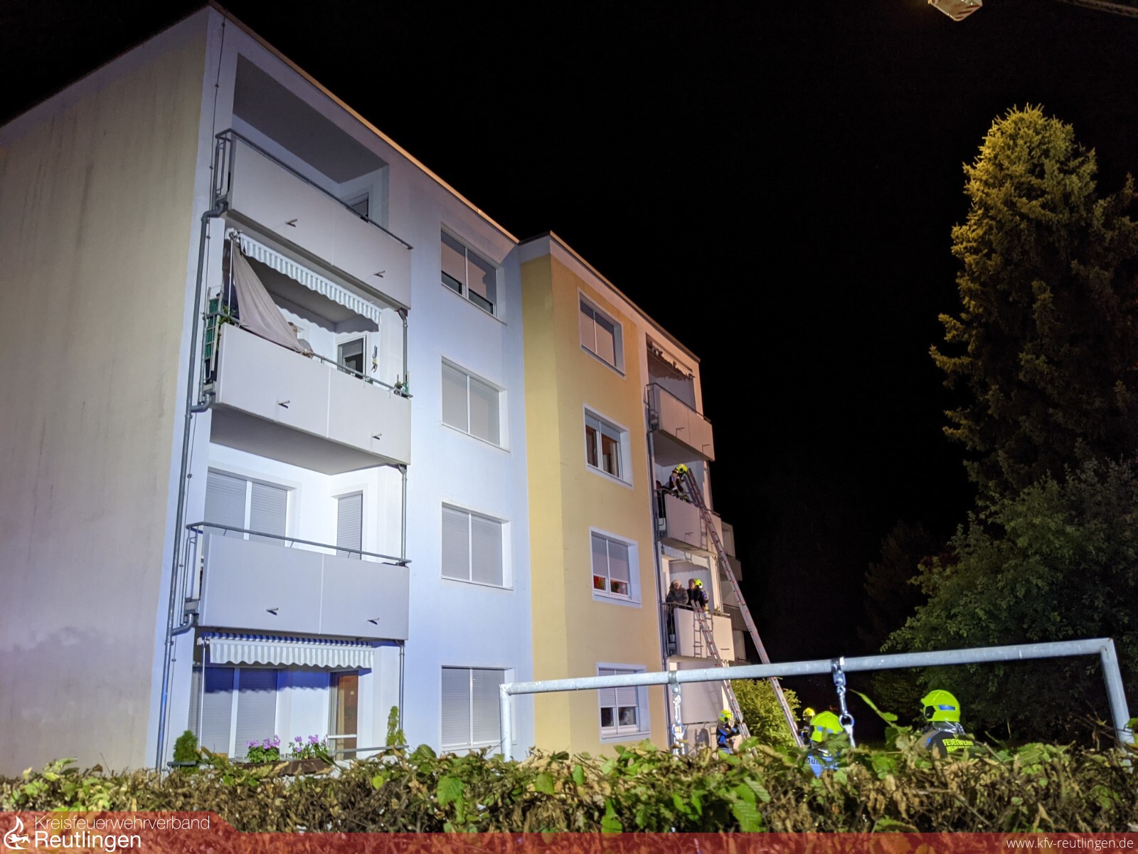 Auf der Gebäuderückseite machten sich fünf Personen auf drei verschiedenen Balkonen bemerkbar. Die Personen waren alle im rauchfreien Bereich. Die Einsatzstelle wurde in zwei Abschnitte eingeteilt. Abschnitt 1 Brandbekämpfung auf der Gebäude Vorderseite, Abschnitt 2 Menschenrettung auf der westlichen Gebäudeseite.