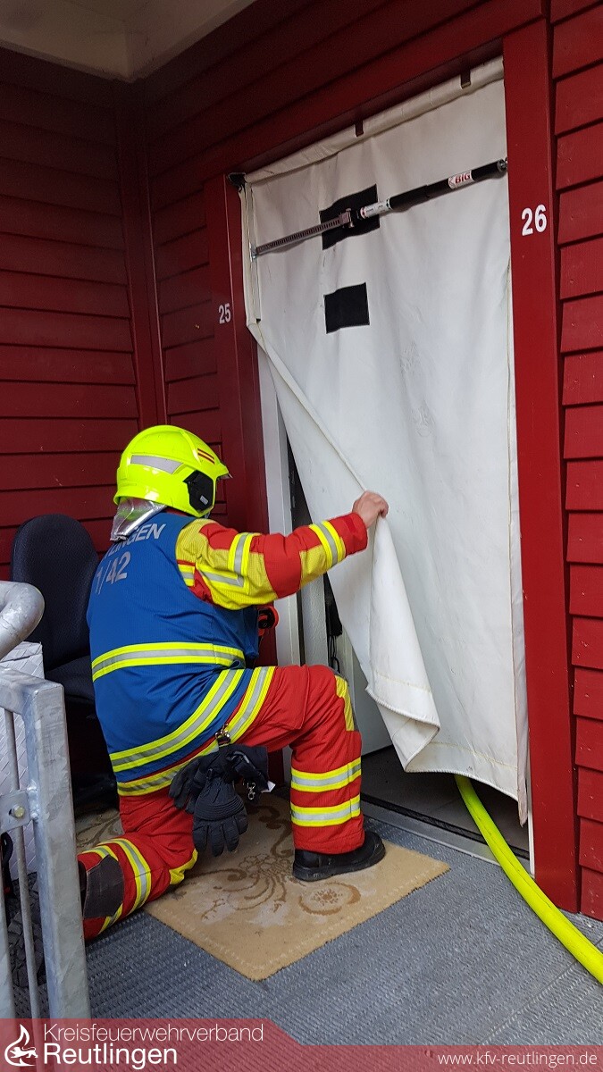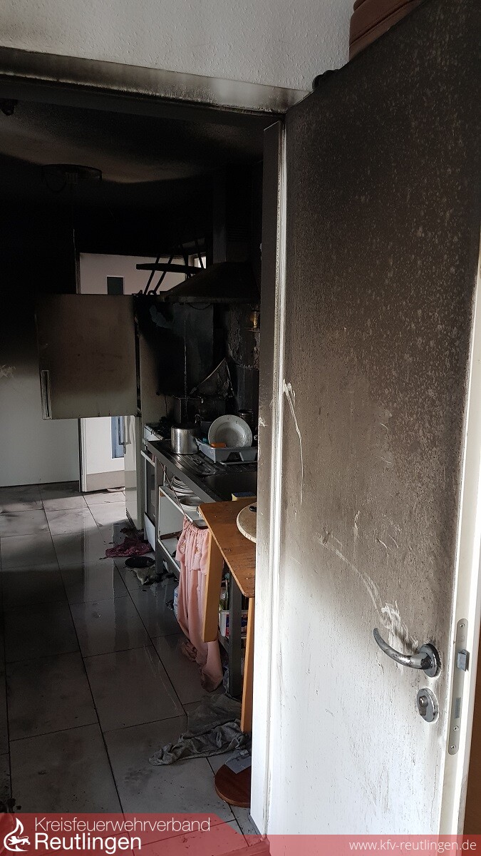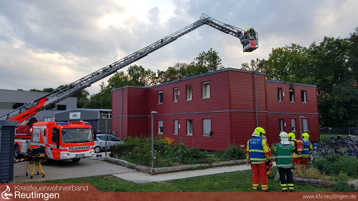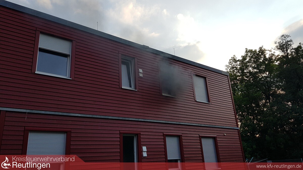 Beim Eintreffen der Feuerwehr drang dichter schwarzer Rauch aus einem Fenster im ersten Obergeschoss. Mitbewohner informierten die Feuerwehr, dass sich vermutlich noch vier Personen in der Wohnung aufhalten sollen. Umgehend wurde ein Atemschutztrupp in die betroffene Brandwohnung zur Menschenrettung beordert. Zum Glück konnten keine Personen aufgefunden werden. Der Löschtrupp leitete parallel die Brandbekämpfung mit einem Löschrohr ein. Die Löschmaßnahmen zeigten schnell Wirkung. Bereits 15 Minuten nach Alarmeingang konnte „Feuer unter Kontrolle“ und kurz darauf „Feuer aus“ gemeldet werden. Eine Brandausbreitung wurde somit verhindert. Die Dach- und Fassadenfläche wurde mit Hilfe der Drehleiter der Feuerwehr Reutlingen auf mögliche Brandnester kontrolliert.