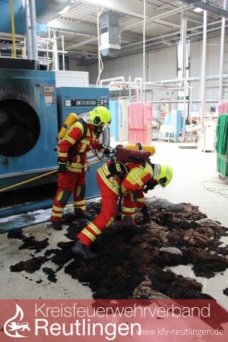 Beim Eintreffen der ersten Kräfte war die Produktionshalle verraucht. In einem mit Gas betriebenen Großtrockner brannte aus ungeklärter Ursache eine Ladung von etwa 60 Kg Frotteetüchern. Mitarbeiter der Firma versuchten noch, mit mehreren Feuerlöschern den Brand unter Kontrolle zu bringen. Da sich die 6 Mitarbeiter im verrauchten Bereich aufhielten und davon ausgegangen werden musste, dass sie Rauchgase eingeatmet haben, wurde der Rettungsdienst nachgefordert.