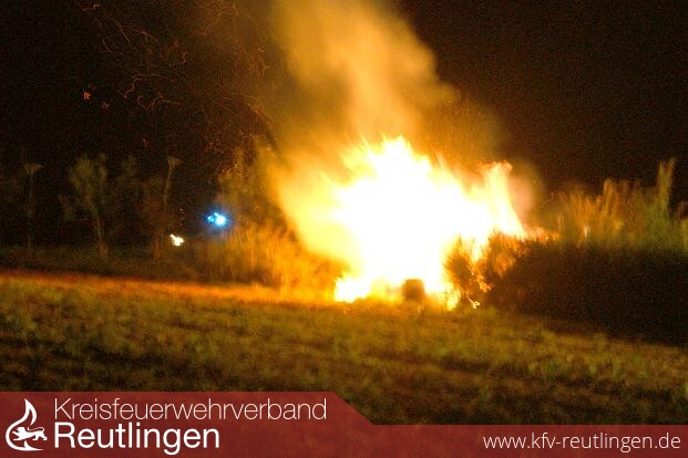 bereits im Vollbrand. Angrenzende Sträucher und Gebüsch wurden ebenfalls