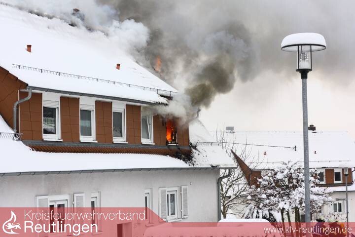 Unmittelbar nach der ersten Erkundung wurde dann auch die Abt. Gniebel sowie eine Drehleiter nachgefordert. Es handelte sich um einen vollentwickelten Wohnungsbrand im Obergeschoss eines Doppelhauses mit vier Wohneinheiten. Der Brand hatte zudem bereits auf das Dach über der brennenden Wohnung übergegriffen.
