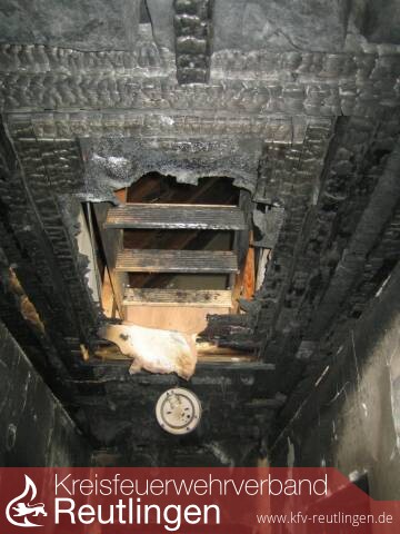 Über die Drehleiter der BF Reutlingen wurde das Dach teilweise geöffnet, sodass eine ausreichend große Öffnung für den eingesetzten Drucklüfter vorhanden war und der Brandrauch aus dem Gebäude geleitet werden konnte.