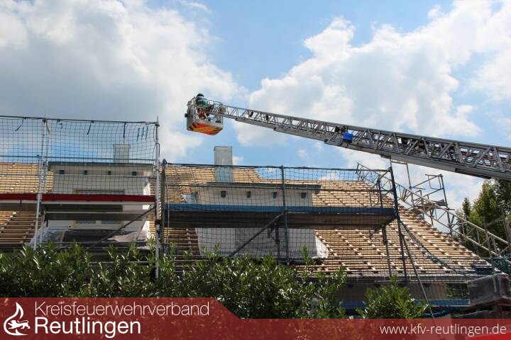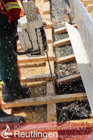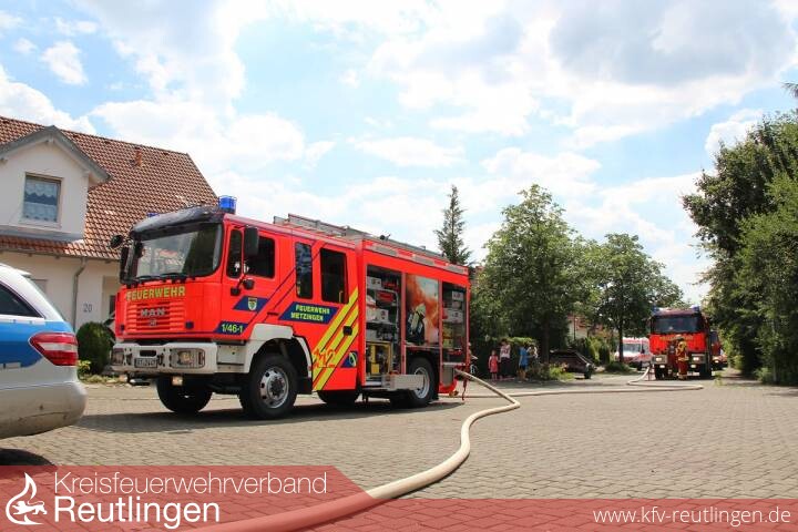 Ein brennender Dachstuhl im Kastanienweg ist am Mittwoch gegen 14:30 Uhr der Leitstelle für Feuerwehr und Rettungsdienst gemeldet worden. Nachbarn hatten bemerkt, dass Flammen aus dem Dach des Einfamilienhauses im Neugreuth schlugen. Noch vor dem Eintreffen der Feuerwehr rückten Nachbarn und Bewohner dem Feuer zu Leibe. Aus noch nicht bekannter Ursache hatte sich auf dem Dach eine größere Menge Isoliermaterial entzündet. Die dabei freigesetzte Hitze war so stark, dass Teile aus Metall, wie beispielsweise Abschlussbleche und die Dachrinne in Teilen geschmolzen sind. Die Feuerwehr setzte einen Trupp unter Pressluftatmer über ein Gerüst und einen weiteren Trupp über die Drehleiter zur Brandbekämpfung ein. Ein weiterer Trupp war im Inneren des Gebäudes im Einsatz, um das Dach zu kontrollieren. Dabei waren an der Innenseite bereits Brandspuren festgestellt worden, so dass das Dach im Anschluss von einer Dachdeckerfirma geöffnet wurde. Die Polizei nahm noch vor Ort die Ermittlungen auf. Kurz vor dem Brandausbruch waren Handwerker auf dem Dach beschäftigt gewesen. Vorsorglich waren vom Rettungsdienst zwei Rettungswagen und das Notarzt-Einsatzfahrzeug aus Bad Urach ins Neugreuth entsandt worden. Glücklicherweise wurde aber niemand verletzt. Über den Sachschaden kann die Polizei zum aktuellen Zeitpunkt noch keine Angaben machen. Die Feuerwehr Metzingen war mit einem erweiterten Löschzug und rund 35 Einsatzkräften an der Brandstelle im Einsatz.