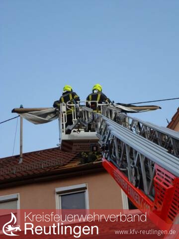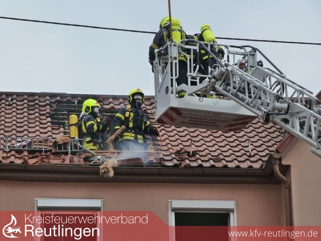 Die Feuerwehr Eningen unter Achalm wurde am Nachmittag des 10.Mai 2016 um 15:44 Uhr zu einem „Brand im Gebäude“ in die Hauptstraße alarmiert. Die ersteintreffenden Einsatzkräfte konnten eine Rauchentwicklung aus dem Dachstuhl sowie ein stark verrauchtes Obergeschoss feststellen. Da sich keine Personen mehr im Gebäude aufhielten, wurden umgehend Brandbekämpfungsmaßnahmen eingeleitet. Hierzu gingen zwei Trupps unter Atemschutz in das Obergeschoss vor. Rasch konnte Feuer unter Kontrolle gemeldet werden. Während des Einsatzverlaufes wurde eine Person vom Rettungsdienst mit Verdacht auf Rauchgasintoxikation vor Ort behandelt. Die weiteren Nachlöscharbeiten gestalteten sich sehr umfangreich. Unter Atemschutz mussten Teile des betroffenen Dachgeschosses ausgeräumt und die Zwischendecke teilweise geöffnet werden, um letzte Glutnester zu beseitigen. Diese Maßnahmen wurden durch das Anbringen einer provisorischen Dachabdeckung beendet. Durch den Rauchgasniederschlag ist das Gebäude vorübergehend unbewohnbar.