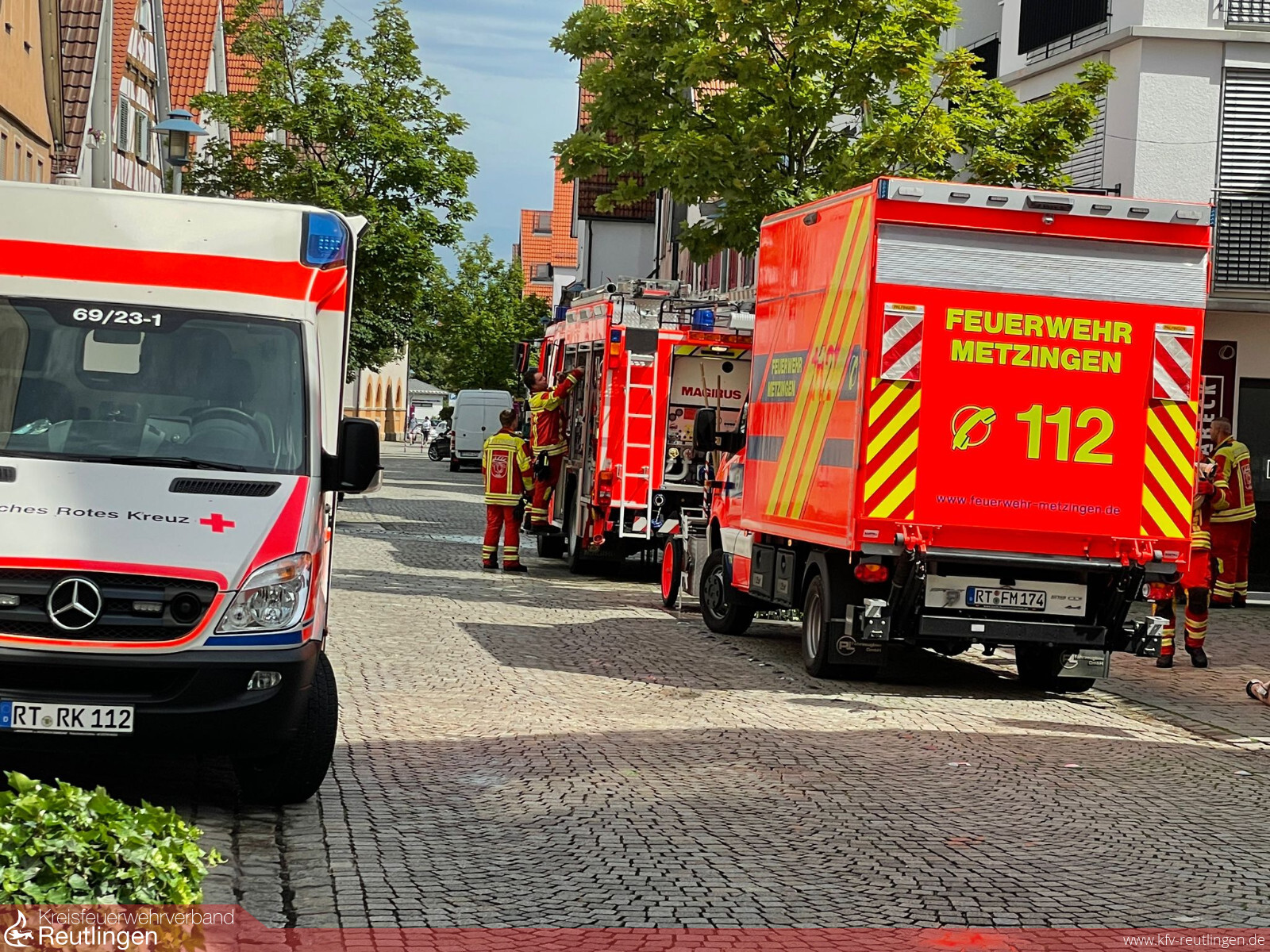 Bei einem heftigen Gewitter hat am Pfingstsonntag der Blitz in ein Sechsfamilienhaus in der Pfleghofstraße in Metzingen eingeschlagen. Nachbarn hatten den Einschlag beobachtet, dem ein ohrenbetäubender Knall folgte. Nachdem sie unmittelbar darauf Rauch hatten aufsteigen sehen, verständigten sie über Notruf die Feuerwehr. Als diese wenige Minuten später mit einem Löschzug und einem weiteren Löschfahrzeug der Abteilung Neuhausen am Einsatzort eintraf, gestaltete sich die Lage zunächst durchaus schwierig, denn ein Feuer war nicht zu erkennen. Messungen mit der Wärmebildkamera zeigten in einer Wohnung, deren Bewohnerin verreist war und die deshalb zuerst gewaltsam geöffnet werden musste, im Bereich des Kniestocks eine minimale Temperaturerhöhung. Weil die Drehleiter mangels Zufahrtsmöglichkeit nicht eingesetzt werden konnte, erfolgte ein Zugang zum Dach mittels Schiebleiter. Auch hier fehlten die nötigen Aufstellflächen, so dass sich die Maßnahmen sehr schwierig und auch nicht ungefährlich gestalteten. Wie sich zeigte, waren die Bemühungen aber nicht umsonst: Unter den Dachziegeln hatte sich der Brand auf einer Fläche von zirka 20 Quadratmetern in der Dämmung und der Holzkonstruktion ausgebreitet. Nach Auskunft der Feuerwehr wäre es eine Frage der Zeit gewesen, bis der gesamte Dachstuhl in Flammen gestanden hätte. Von der Feuerwehr ist das Feuer abgelöscht worden. Die verbrannten Teile der Holzkonstruktion sind anschließend ersetzt, das Dach wieder eingedeckt worden. Kurz vor 12 Uhr war der Einsatz abgeschlossen. Neben der Feuerwehr und der Polizei waren auch der Rettungsdienst des MHD mit einem Rettungswagen, der organisatorische Leiter Rettungsdienst sowie die DRK-Bereitschaft Metzingen mit zwei Fahrzeugen im Einsatz. Verletzte gab es nicht zu beklagen. Die Bewohner durften nach Abschluss der Einsatzmaßnahmen wieder in ihre Wohnungen. Durch den umsichtigen Einsatz ist der Sachschaden gering ausgefallen. Die Metzinger Feuerwehr ist am Pfingstmontag noch zu zwei weiteren witterungsbedingten Einsätzen gerufen worden.