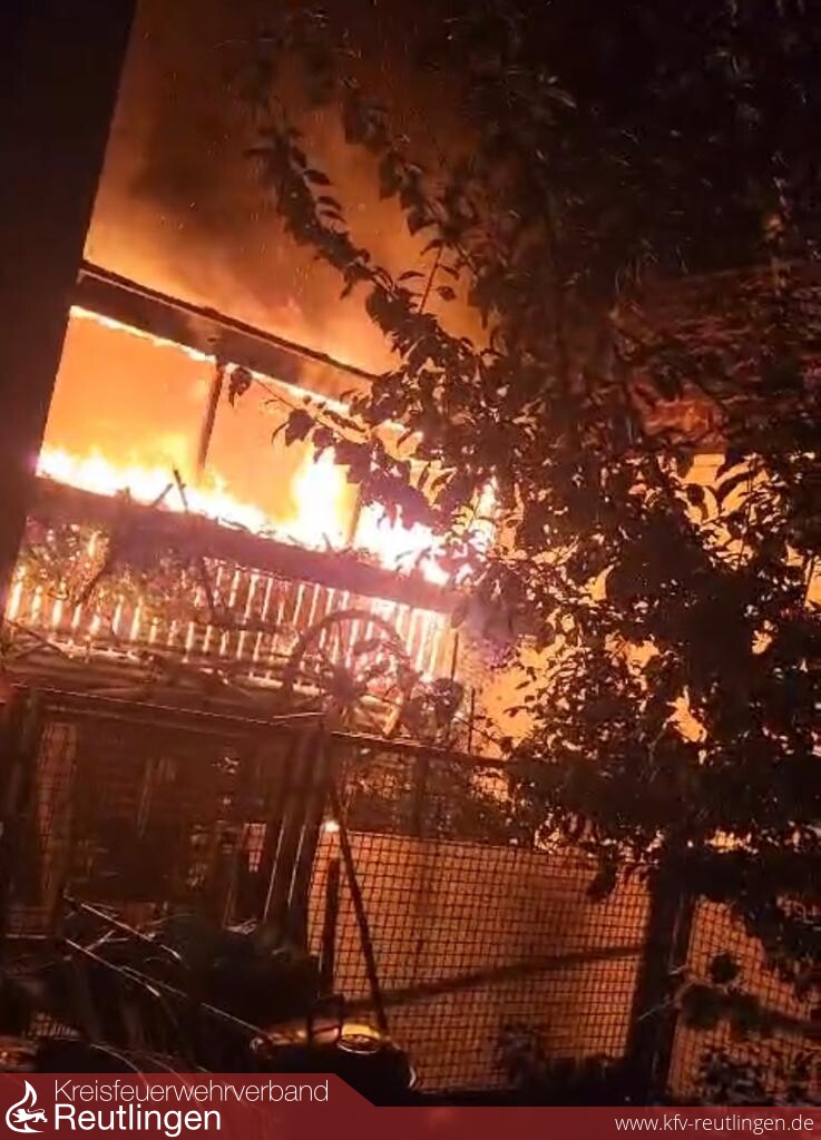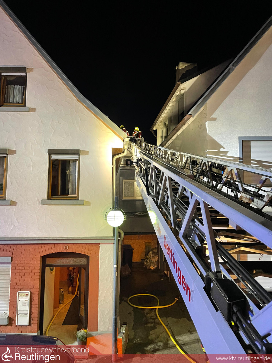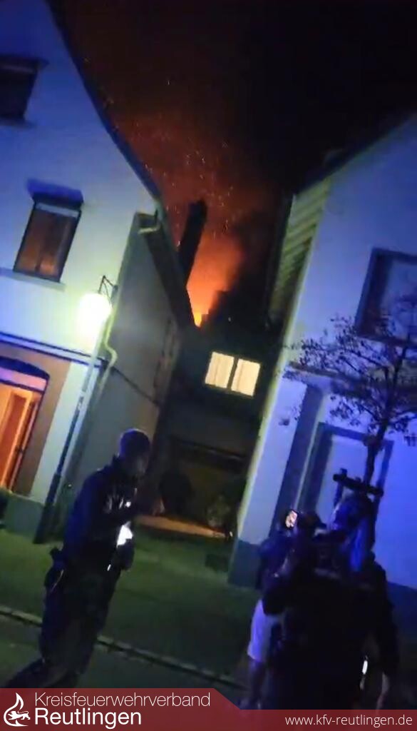 Am Montag um 00.38 Uhr sind bei der Integrierten Leitstelle Reutlingen und dem Polizeinotruf mehrere Anrufe über einen Brand im Dachbereich eines Wohnhauses in der Metzinger Straße eingegangen. Bei Eintreffen der Rettungskräfte schlugen bereits offene Flammen aus dem Dachstuhl. Die beiden Bewohner des Hauses hatten sich schon selbstständig ins Freie begeben. Aufgrund der engen Bebauung drohte das Feuer zunächst auch auf die beiden angrenzenden Gebäude überzugreifen, was durch die Feuerwehr verhindert werden konnten. Lediglich die Fassade eines angrenzenden Hauses wurde in Mitleidenschaft gezogen. Personen wurden nicht verletzt, der entstandene Sachschaden wird auf mindestens 150.000 Euro geschätzt. Das Haus ist nicht mehr bewohnbar, die beiden Bewohner kommen zunächst bei Bekannten unter. Die Ermittlungen zur Brandursache dauern an. (Quelle Polizei Reutlingen)