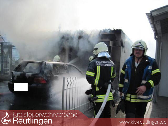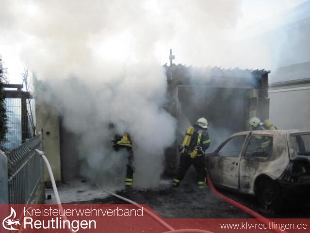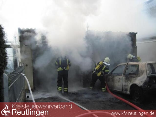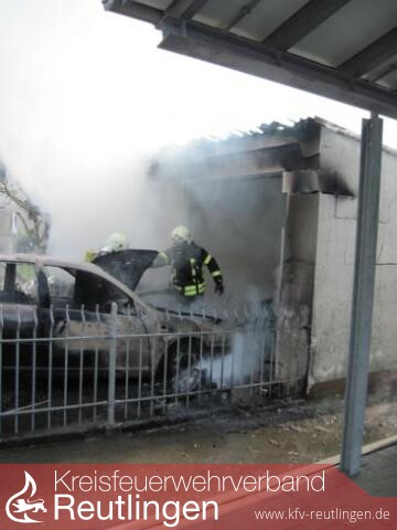 Beim Eintreffen der ersten Einsatzkräfte der Feuerwehr waren bereits die Doppelgarage und das Auto im Vollbrand. Mit lautem Knall explodierten die Reifen am Auto. Dicker schwarzer Rauch drang aus der Garage.