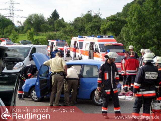 Zu einem Verkehrsunfall kam es am Dienstag kurz vor 8 Uhr auf dem Zubringer zur Nordtangente in Metzingen. Eine 18 Jahre alte Frau war mit ihrem VW Lupo auf der B 312 unterwegs. Nachdem sie auf Höhe des Gewerbegebietes Längenfeld auf die Nordtangente abgebogen war, geriet sie mit ihrem Wagen im Verlauf einer lang gezogenen Linkskurve zu weit nach rechts und touchierte die Leitplanke. Anschließend stellte sich der Wagen quer und kollidierte mit der Beifahrerseite mit einem ordnungsgemäß entgegenkommenden Transporter. Dessen Fahrer hatte zwar noch eine Notbremsung eingeleitet, konnte den Zusammenstoß aber nicht mehr verhindern. Durch den Aufprall zogen sich die beiden Insassen im Lupo so schwere Verletzungen zu, dass sie von zwei Notärzten versorgt wurden. Sie kamen anschließend zur Behandlung ins Klinikum am Steinenberg nach Reutlingen. Eine weitere Autofahrerin, die den Unfall beobachtet hatte, musste ebenfalls ins Krankenhaus gebracht werden, weil sie sich einen Schock zugezogen hatte. Von der Feuerwehr wurden die Verletzten bis zum Eintreffen des Rettungsdienstes versorgt. Nach der Befreiung aus dem demolierten Auto übernahm die Wehr zudem die Reinigung der Straße, der rund eine Stunde lang für den gesamten Verkehr gesperrt werden musste.