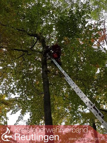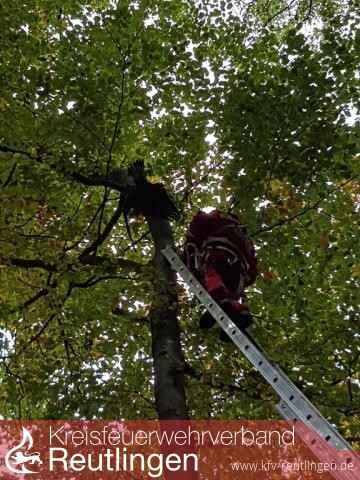 Um die Mittagszeit wurde die Feuerwehr Reutlingen erneut zu einer Tierrettung alarmiert. Bereits zu Beginn des Monats musste ein Pferd in Ohmenhausen aus einem Entwässerungsgraben gerettet werden. Dieses Mal wurde der Integrierten Leitstelle für Feuerwehr und Rettungsdienst mitgeteilt, dass ein Greifvogel im Bereich der Roßbergsteige in einem Baumwipfel abseits der Straße festklemmt und nicht mehr freikommt. Ein aufmerksamer Wanderer hatte das Tier in seiner hilflosen Lage in rund 12 m Höhe entdeckt.