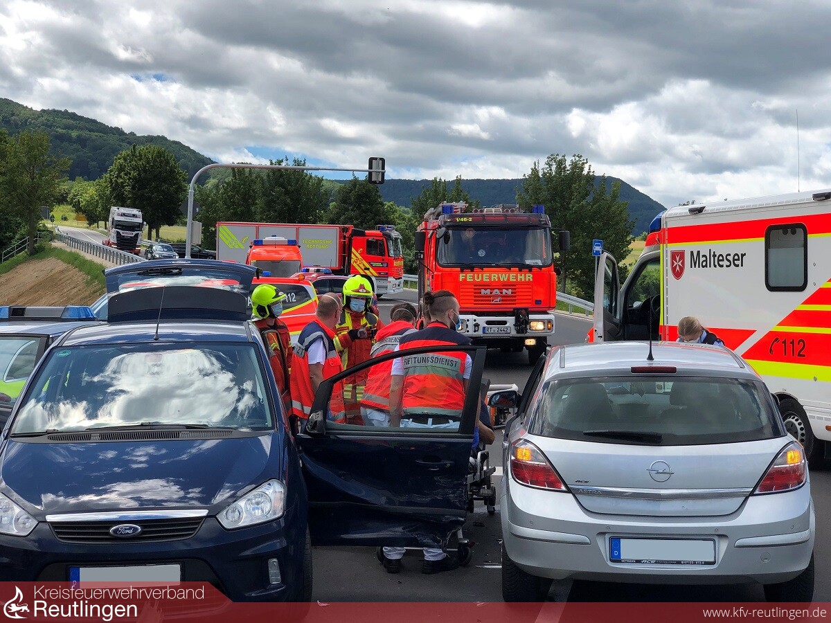 In der Mittagszeit ereignete sich in der sogenannten Schlössleskurve zwischen Metzingen-Neuhausen und Dettingen an der Erms ein Verkehrsunfall zwischen zwei Autos. Die Besatzung des Rettungswagens forderte nach der Erkundung die Feuerwehr zur Befreiung einer eingeschlossenen verletzten Person an.