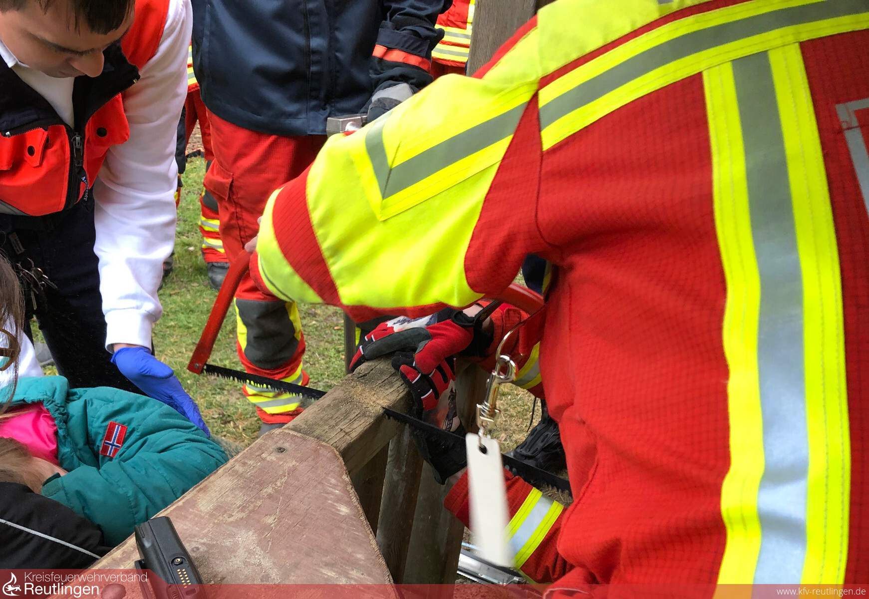 Schreckminuten für eine Mutter und ihr Kind am gestrigen Freitag in Glems: Kurz vor 16 Uhr tollte das Kind auf einem Spielplatz herum, als es mit seinen Schenkeln zwischen die Rundhölzer einer Spiel-Veranda geriet. Alle Versuche der Mutter, ihr Kind aus der misslichen Lage zu befreien, scheiterten, so dass sie den Notruf wählte. Von der Leitstelle in Reutlingen wurden daraufhin neben der Polizei und dem Notarzt aus Bad Urach der Rettungswagen des Malteser Hilfsdienstes aus Metzingen und die Feuerwehr alarmiert. Vor Ort stellten die Einsatzkräfte ein wimmerndes Kind fest, dass sich so hilflos zwischen den Rundhölzern verkeilt hatte, dass es sich nahezu überhaupt nicht mehr bewegen konnte. Die Kräfte der Abteilung Glems verschafften sich durch den Einsatz einer Handsäge so viel Freiraum, dass es mit vereinten Kräften gelang, das Kind aus seiner hilflosen Lage zu befreien. Nach Angaben der Feuerwehr Metzingen kam es mit dem Schrecken davon und wurde nach der Kontrolle durch den Notarzt in die Obhut der tapferen Mama übergeben. Im Erzählkreis, heißt es in der Pressemitteilung der Feuerwehr weiter, werde das Kind am Montag einiges zu berichten haben, wie es nach der erfolgreichen Rettung verkündete.