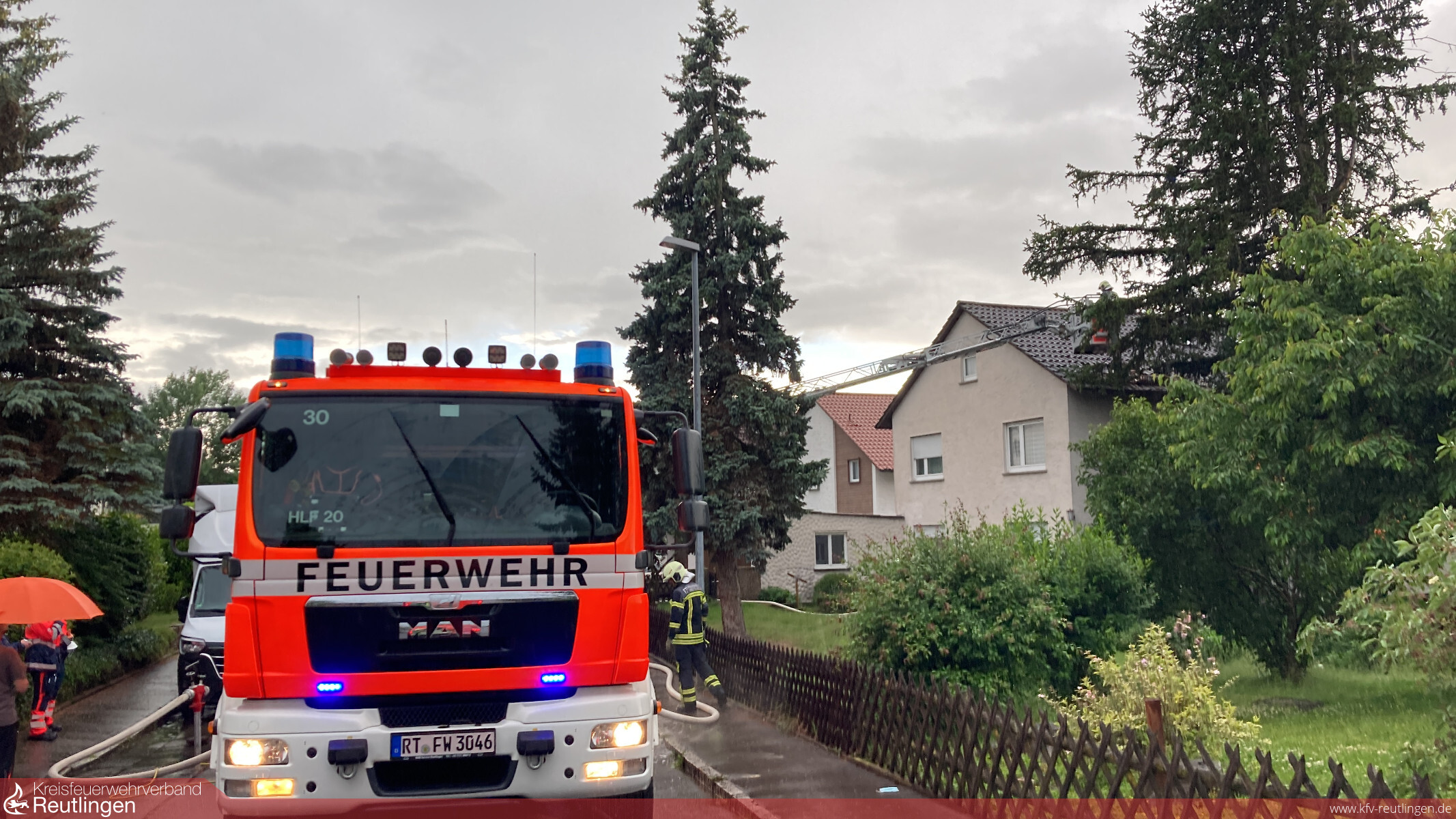 Während am Abend eine Gewitterfront über Reutlingen und Pfullingen zog erhielt die Leitstelle für Feuerwehr und Rettungsdienst über den europaweiten Notruf 112 eine Meldung über einen Blitzeinschlag in einem Wohngebäude in der Brahmsstraße. Zur Kontrolle des Gebäudes wurden der Einsatzleitungsdienst sowie ein Hilfeleistungslöschfahrzeug alarmiert. Vor Ort konnte eine Verrauchung des Treppenraums im Nachbarhaus festgestellt werden, sodass sofort weitere Einheiten von Feuerwehr, Rettungsdienst und Polizei hinzugezogen wurden. Der Brand im Kellerraum konnte schnell unter Kontrolle gebracht werden. Die umliegenden Gebäude wurden ebenfalls durch die Einsatzkräfte und den durch die Feuerwehr verständigten Stromversorger kontrolliert. Mehrere Personen berichteten von einem Ausfall der Stromversorgung und der Telekommunikationsnetze. Durch das kurze, aber heftige Gewitter war es in einigen Gebäuden zu Schäden der Netzgeräte und Telefonanlagen gekommen. Weitere Brände haben sich glücklicherweise aber nicht entwickelt. Ein abgedecktes Dach wurde durch die Feuerwehr mittels Drehleiter wieder verschlossen.