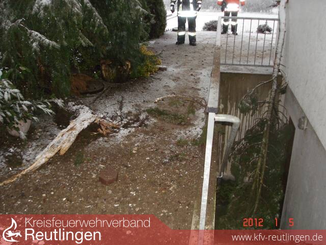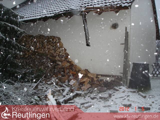 Zum Glück wurde niemand der Familie, welche sich zu diesem Zeitpunkt im Haus befand, verletzt auch kam es dabei zu keinem Brand an dem Gebäude, aber zu einem erheblichen Schaden. Neben der Garage, welche an das Wohnhaus anschließt, schlug der Blitz in eine Tanne ein, diese wurde regelrecht zerfetzt, entwurzelt und ca. 5m durch die Luft und an den Giebel des Hauses geschleudert. Die Dachrinne der Garage wurde komplett abgerissen. Im Wohnhaus wurde an mehreren Stellen die Schalter und Steckdosen aus der Wand gerissen, am Stromkasten ist der Hauptschalter total verkokelt. Auch an den Außenwänden ist an mehreren Stellend der Putz abgeplatzt. Sämtliche Häuser in der Straße waren ohne Strom. Von der Feuerwehr wurde das ganze Haus auf mögliche Brandnester oder größere Schäden kontrolliert. Der Hausbesitzer kontaktierte die EnBW.