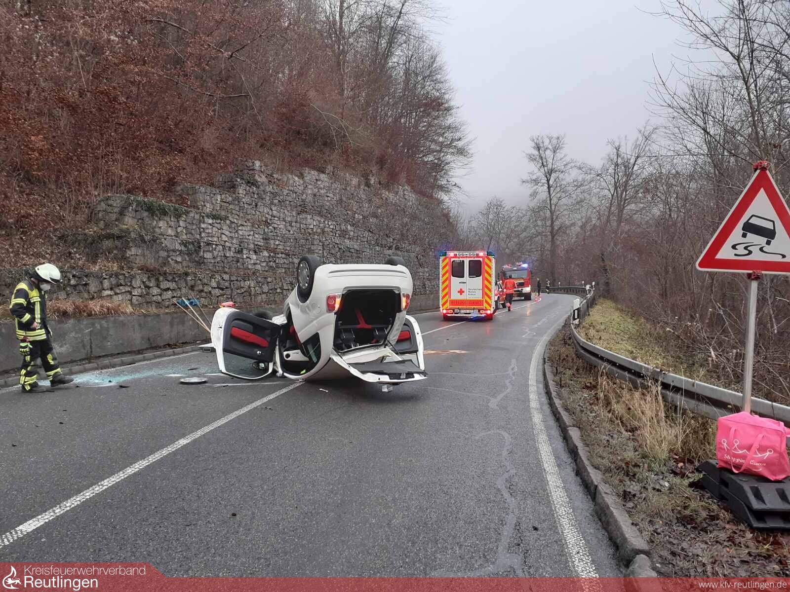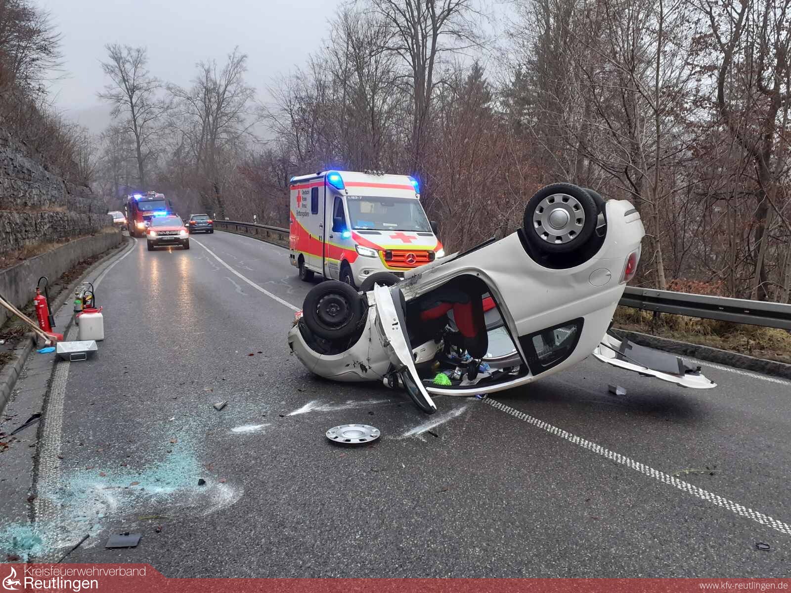 Die Fiat 500 Fahrerin kam allein beteiligt, aus noch ungeklärter Ursache, von der Fahrbahn ab. In Folge dessen, überschlug sich das Fahrzeug und blieb auf dem Dach liegen.