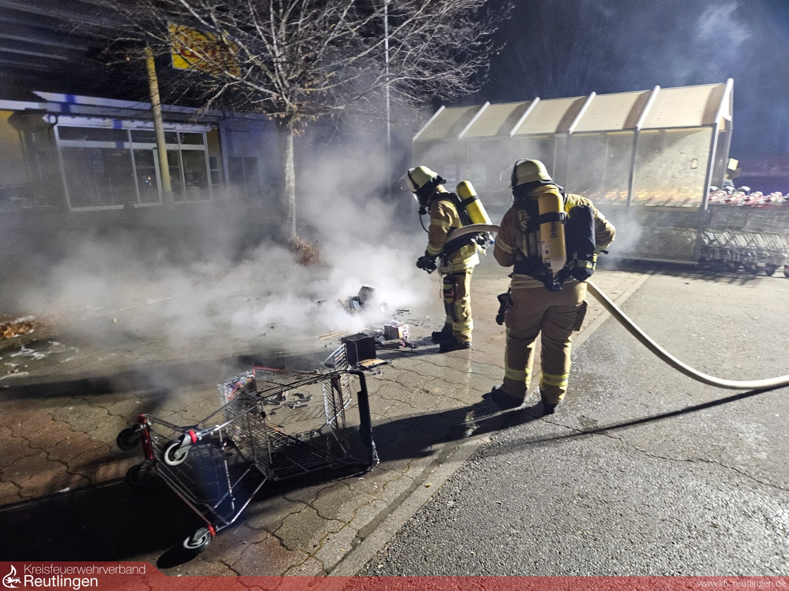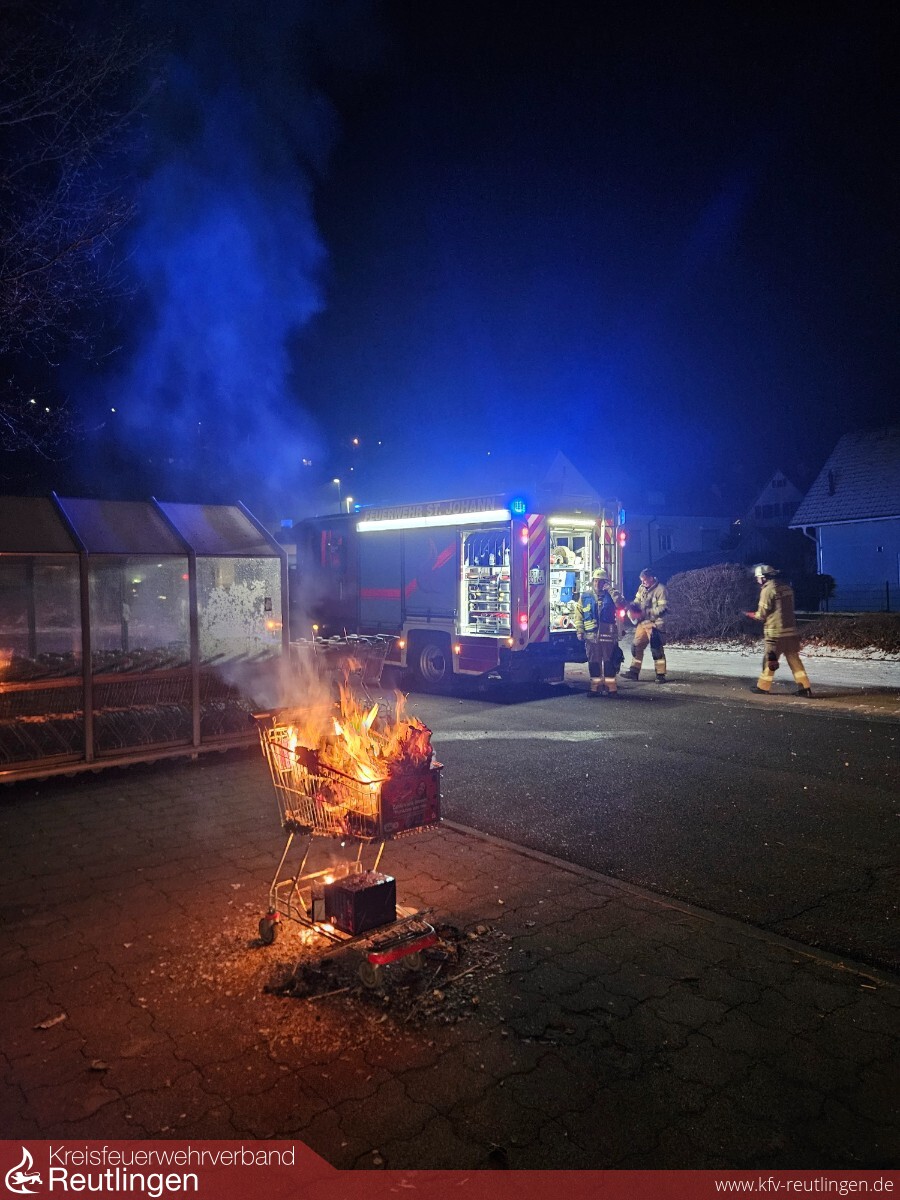 Am 01.01.2026 wurde die Freiwillige Feuerwehr St. Johann um 1:22 Uhr zu einem Kleinbrand in Würtingen alarmiert. Vor Ort trafen die Einsatzkräfte einen brennenden Einkaufswagen an. Mit dem Schnellangriff konnte der Brand durch das Team des HLF 10 unter Atemschutz schnell gelöscht werden. Um 1:49 Uhr konnte „Feuer aus“ gemeldet werden. Kommandant Max Werz setzte die abschließende Lagemeldung ab und die Einsatzstelle wurde an die Polizei übergeben. Personen wurden keine verletzt. Sachschaden ist entstanden. Vermutlich wurde der Wagen vorsätzlich in Brand gesteckt. Die Polizei ermittelt.