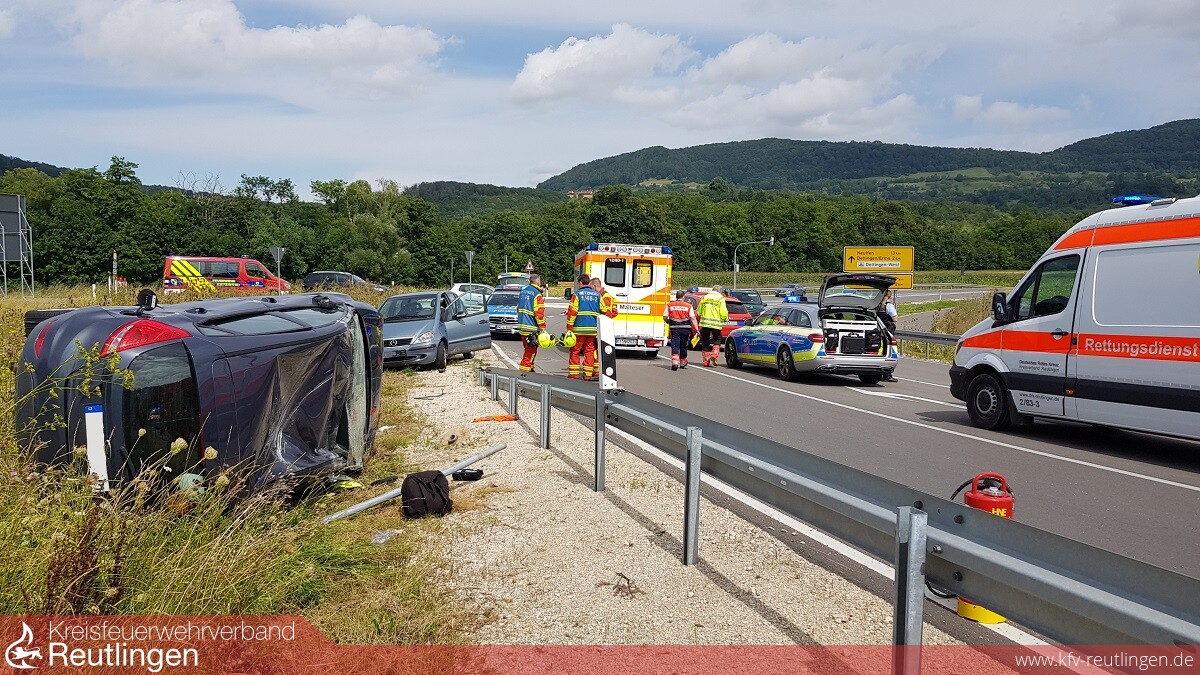 Die Integrierte Leitstelle Reutlingen wurde um 13:11 Uhr durch einen Verkehrsteilnehmer über einen Verkehrsunfall auf der Landstraße 380a, zwischen Metzingen und Dettingen/Erms informiert. Erste Informationen berichteten über zwei beteiligte Fahrzeuge, ein PKW hat sich wohl mehrfach überschlagen, mehrere Verletzte Personen.