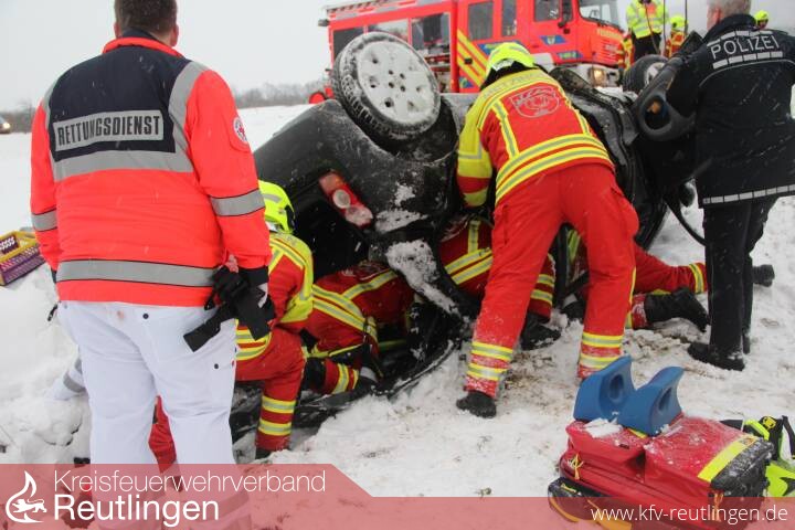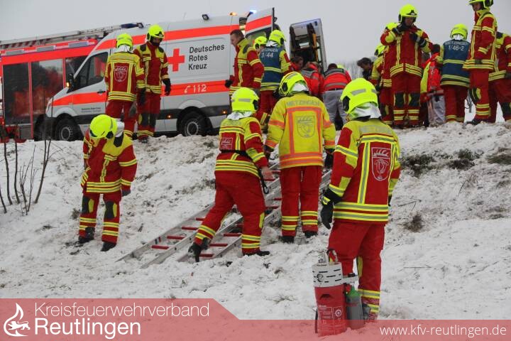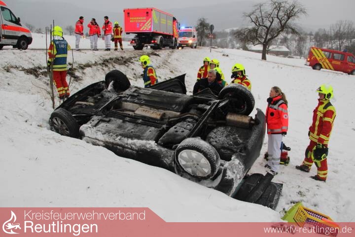 Für die Witterungsverhältnisse zu schnell war eine 56-jährige Frau.. Sie war mit ihrem Nissan Micra auf der Landesstraße 380A von Glems in Richtung Neuhausen unterwegs. In einer Rechtskurve kam sie nach links von der Fahrbahn ab, überfuhr zwei Leitpfosten und schlitterte in einen Wasserlauf. Dort kippte das Fahrzeug und kam auf dem Dach zum Liegen. Die Fahrerin und ihre 82-jährige Beifahrerin wurden bei dem Unfall zum Glück nur leicht verletzt. Während sich die Fahrerin selbst aus dem total beschädigten Auto befreien konnte, musste die eingeklemmte Beifahrerin von der Feuerwehr befreit werden. Die Feuerwehr brachte die Verletzte über Steckleitern auf die Straße, wo die Frau vom Rettungsdienst übernommen wurde. Zuvor hatten die First Responder der Abteilung Glems die Erstversorgung der Verunglückten übernommen. Im Anschluss unterstützte die Feuerwehr die Bergungsarbeiten. Am Nissan ist Totalschaden entstanden.