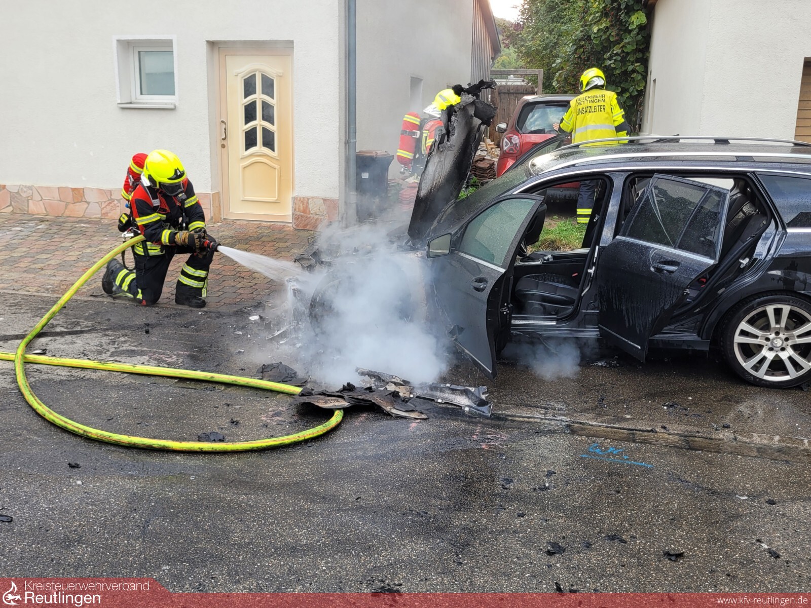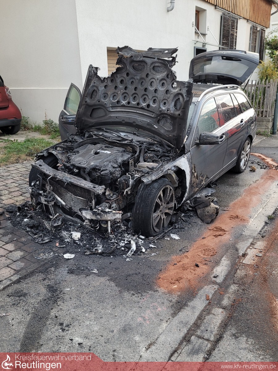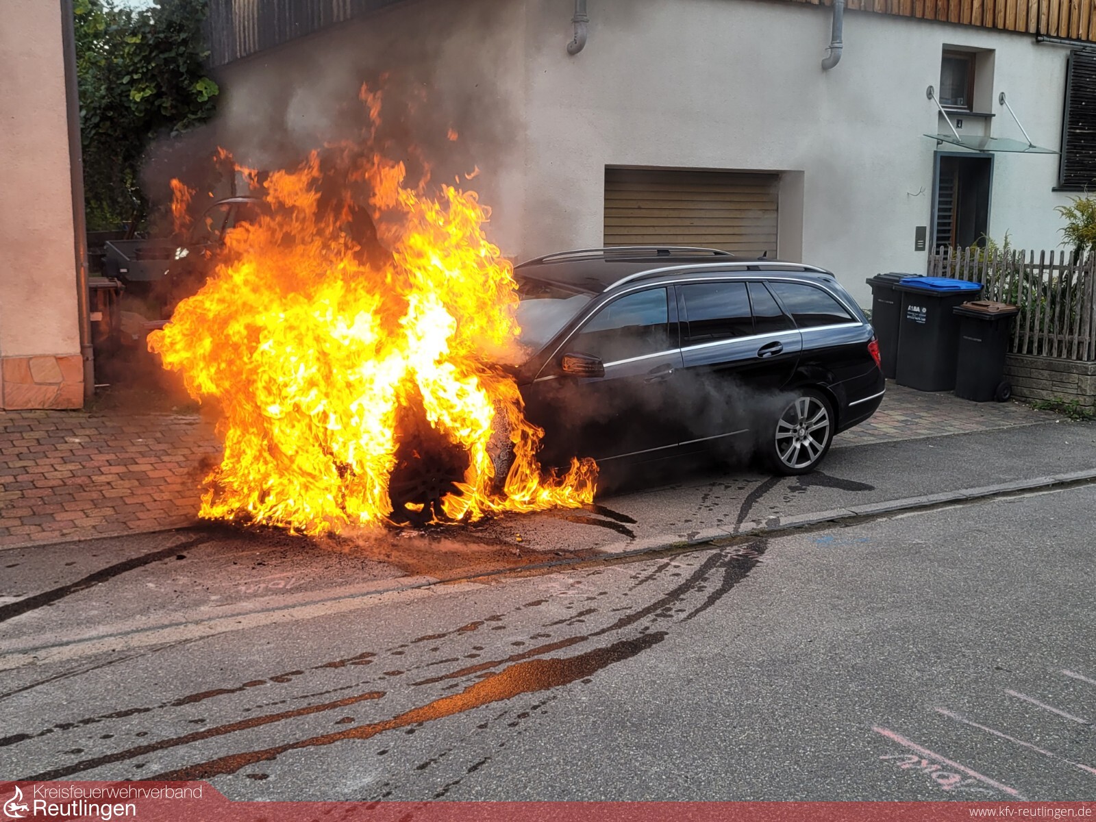 Zu einem brennenden Fahrzeug ist die Feuerwehr und Polizei am Freitagnachmittag gegen 17.15 Uhr in die Goethestraße ausgerückt. Dort kam es nach ersten Erkenntnissen auf Grund eines technischen Defekts zum Brand eines Mercedes. Erste Löschversuche des Eigentümers waren nicht erfolgreich, weshalb der Brand durch die Feuerwehr gelöscht werden musste. Am ausgebrannten Pkw entstand Totalschaden in Höhe von ca. 20.000 Euro. Weiterhin wurde eine Hauseingangstür eines Nachbargebäudes leicht beschädigt. Hier beläuft sich der Schaden auf ca. 300 Euro. (Quelle Polizei Reutlingen)
