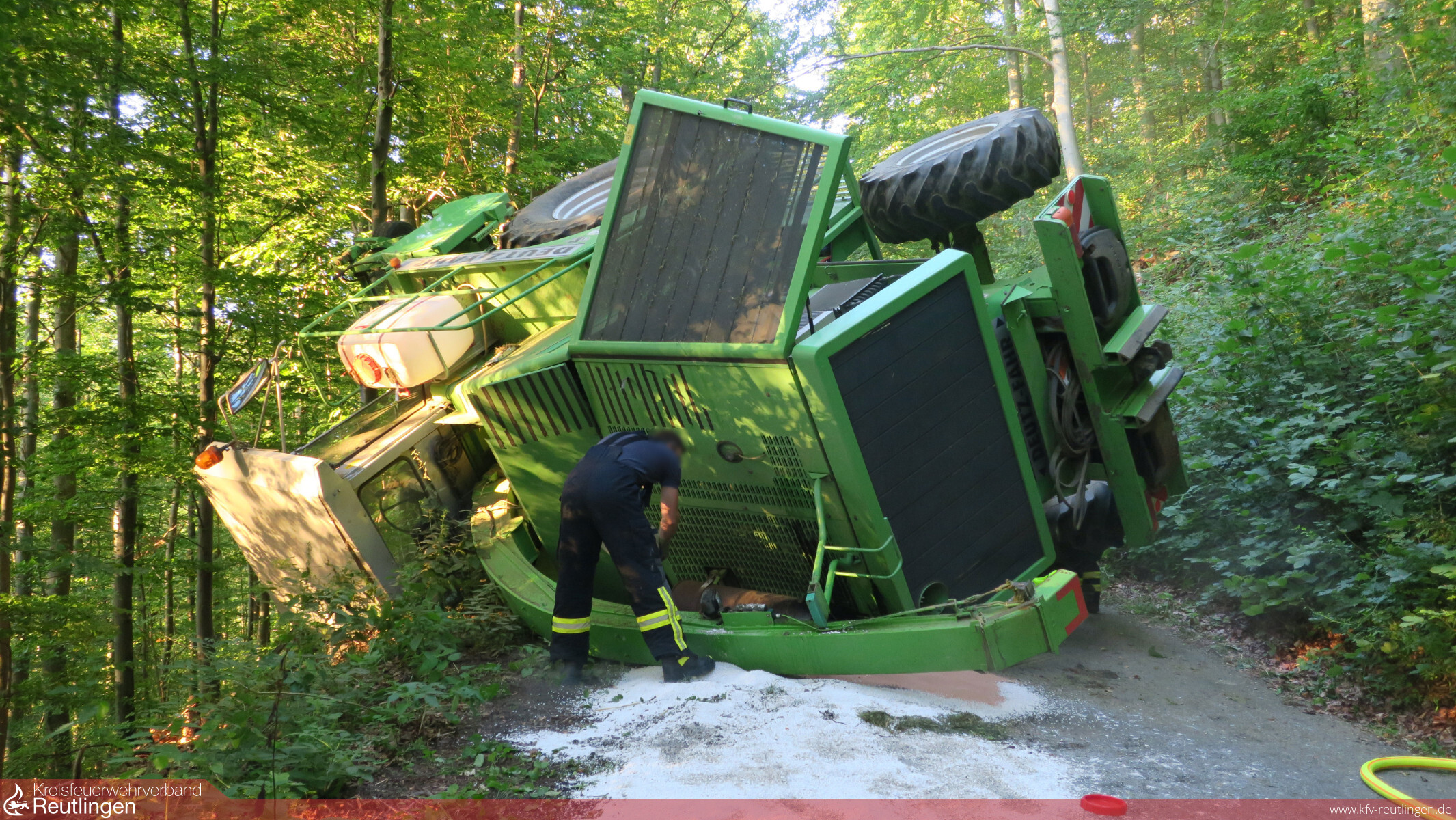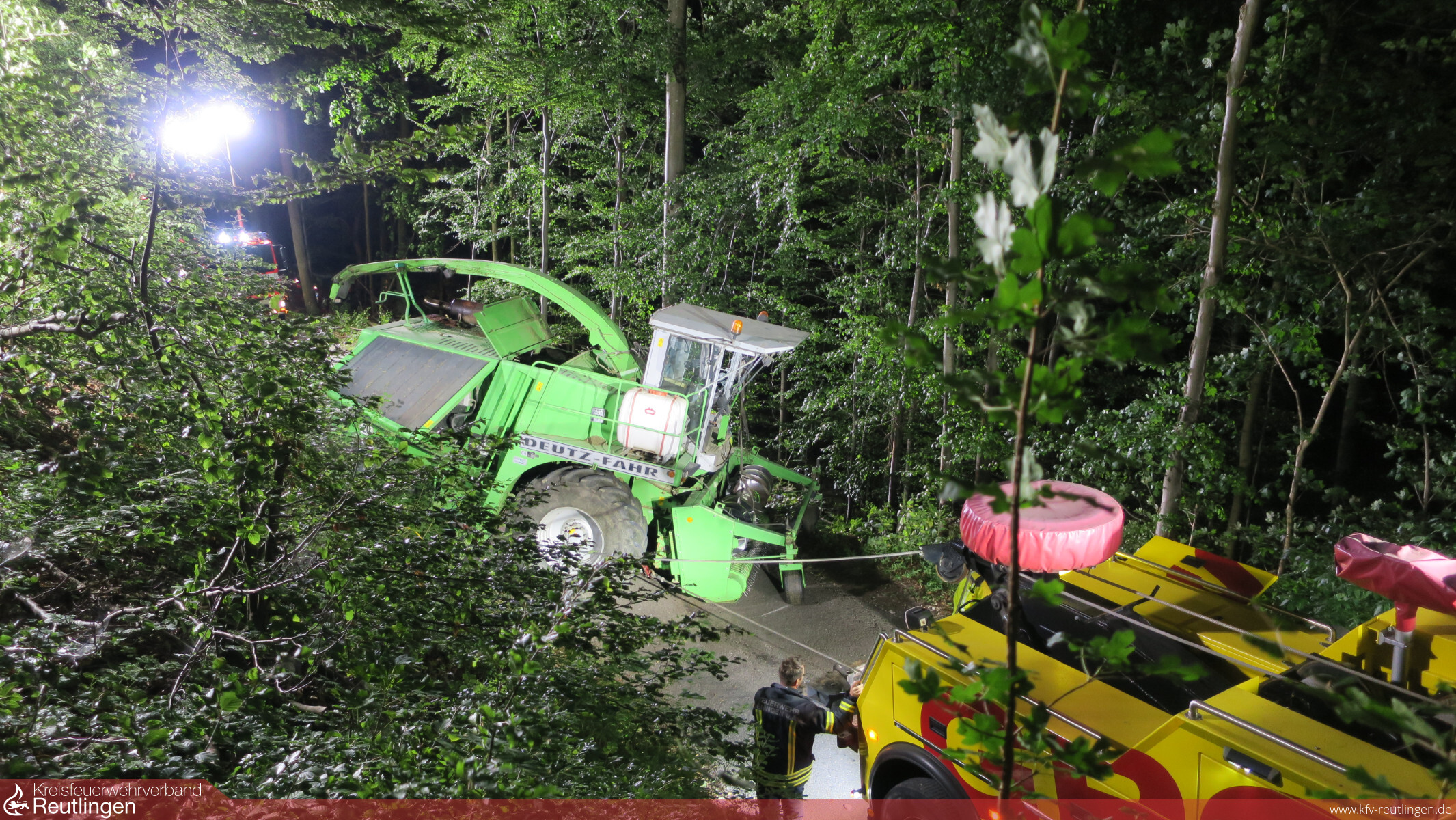 Um 18:58 Uhr am Mittwochabend erfolgte die dritte Alarmierung der Feuerwehr Eningen unter Achalm an diesem Tag, welche die Feuerwehrmitglieder zu einem nicht alltäglichen Einsatz rief. Auf dem Verbindungsweg zwischen unterem und oberem Lindenhof, welcher im Volksmund auch als Steigsteige oder Arbachquelle bezeichnet wird, war ein Feldhäcksler (landwirtschaftliches Gerät) umgestürzt. Als erste Maßnahmen wurden auslaufende Betriebsstoffe aufgenommen sowie weitere Einsatzkräfte nachalarmiert. Im Verlauf des Einsatzes fuhren der Feuerwehrkran und der Rüstwagen der Feuerwehr Reutlingen, ein weiteres Löschgruppenfahrzeug aus Eningen sowie ein Bergeunternehmen die Einsatzstelle an. Der Fahrer des Fahrzeugs sowie ein Feuerwehrmann zogen sich leichte Verletzungen zu, welche vom Rettungsdienst ambulant vor Ort behandelt wurden. Die Einsatzmaßnahmen dauerten bis in die Abend- bzw. Nachtstunden an, sodass die Einsatzstelle in der Folge entsprechend ausgeleuchtet werden musste.