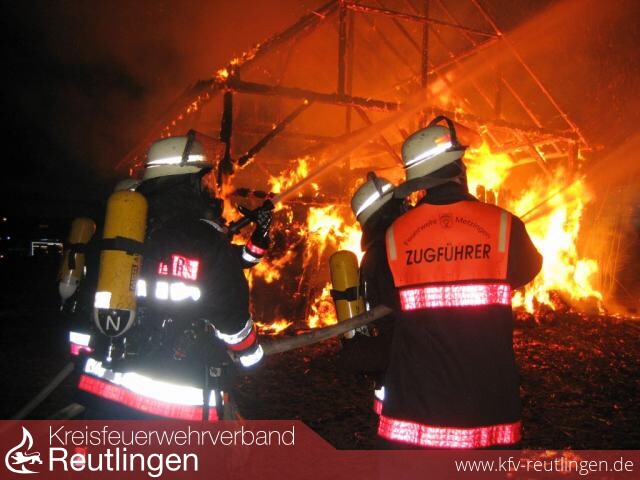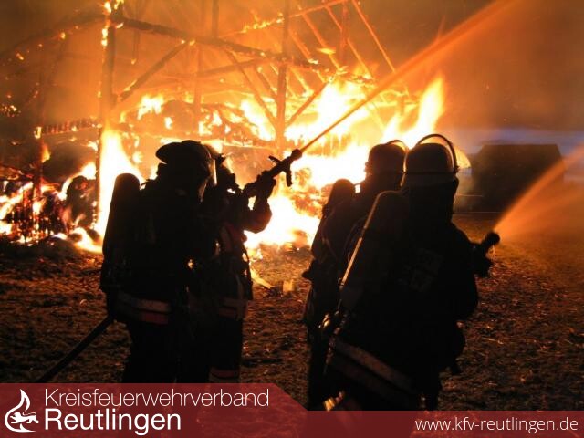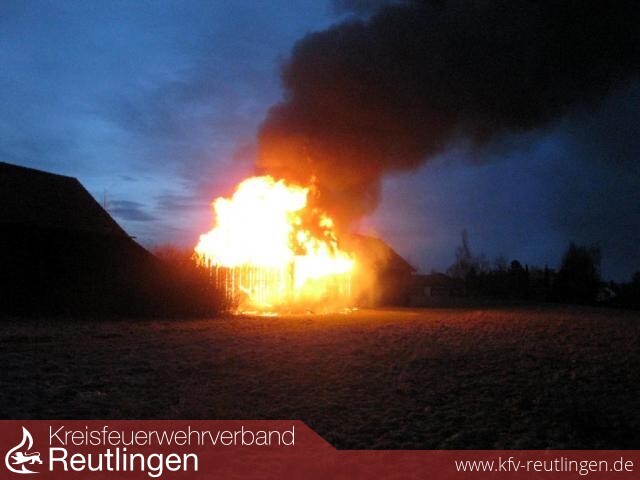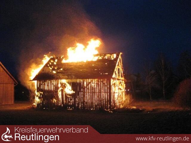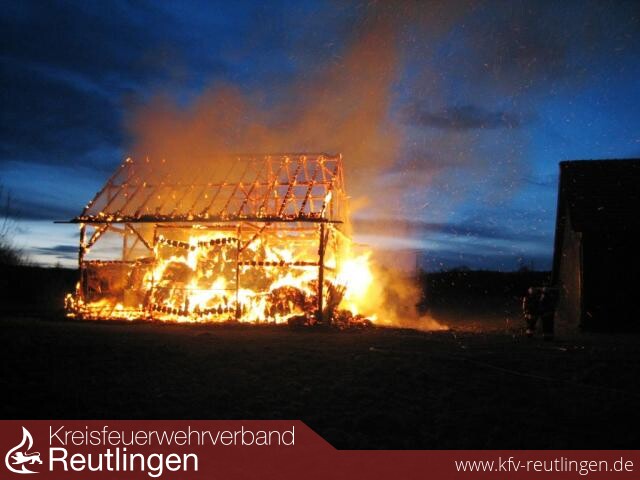 Ein Raub der Flammen wurde eine große Feldscheune am Paul-Ehrlich-Weg in Metzingen. Um kurz nach 18 Uhr standen die Telefone auf der Leitstelle in Reutlingen nicht mehr still: Weithin war das Feuer sichtbar. Weil in der Scheune neben landwirtschaftlichen Gerätschaften große Mengen Heu und Stroh gelagert waren, breitete sich der Brand rasend schnell aus. Der Feuerwehr blieb nichts anderes übrig, als in einem konzentrierten Einsatz ein Übergreifen auf zwei benachbarte Feldscheunen zu verhindern. Dazu wurden vier Strahlrohre eingesetzt. Erst, als die Löschwasserversorgung sichergestellt war, konnten sich dir rund 35 Einsatzkräfte der eigentlichen Brandbekämpfung zuwenden. Sie konnten jedoch nicht verhindern, dass das landwirtschaftliche Objekt komplett nieder brannte. Der Schaden wird mit mehreren zehntausend Euro beziffert. Verletzt wurde niemand. Brandstiftung kann als Brandursache nicht ausgeschlossen werden.