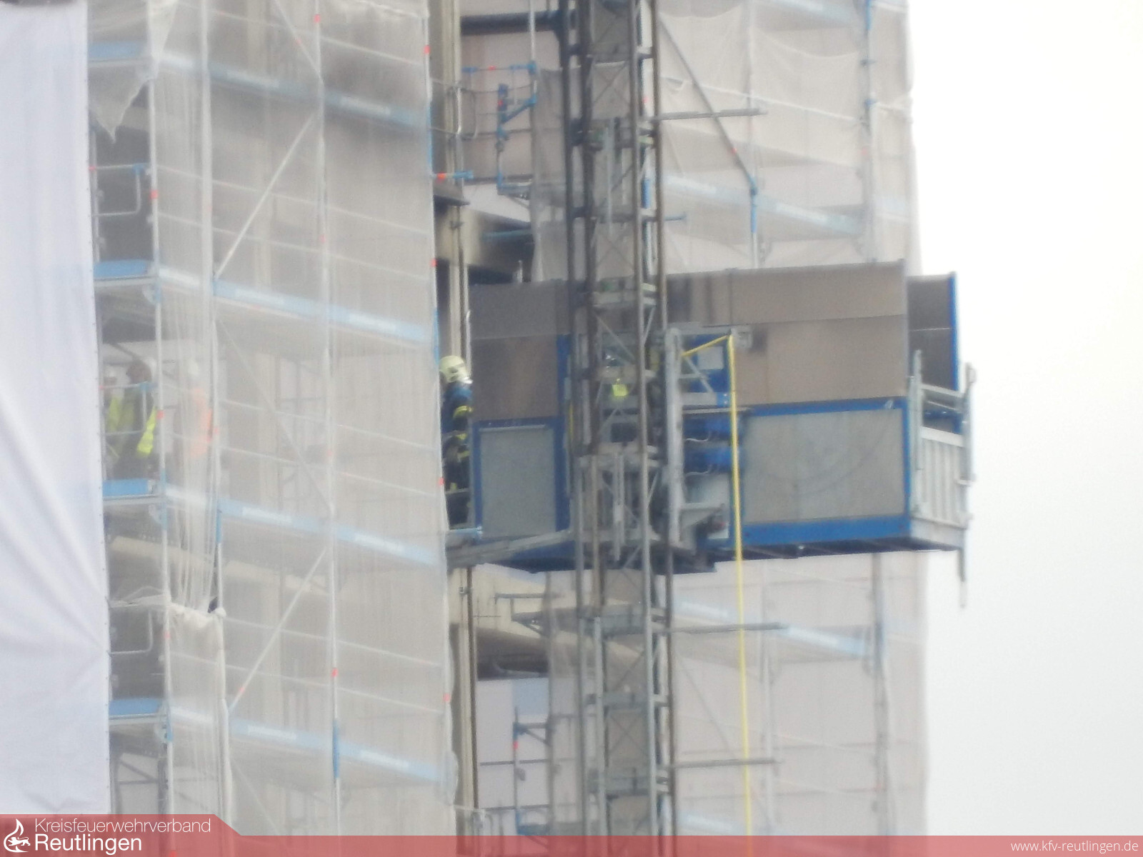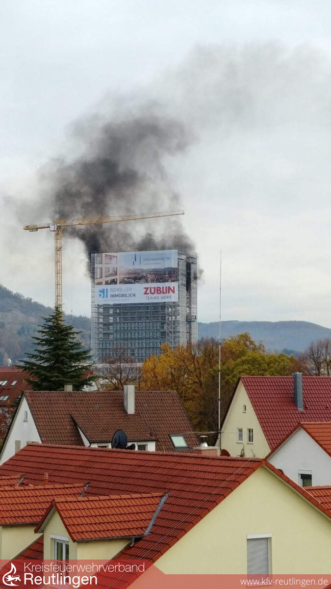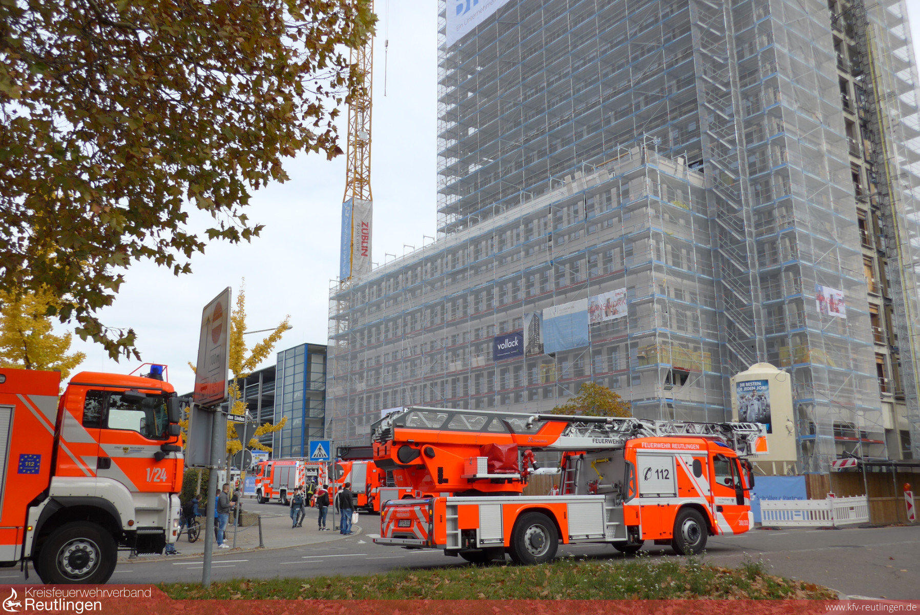 Damit setzte er den Löschzug der Berufsfeuerwehr Reutlingen, ergänzt durch die Freiwillige Feuerwehr Abteilung Stadtmitte mit einem weiteren Löschzug, in Marsch. Da sich das Hochhaus Stuttgarter Tor derzeit noch im Bau befindet, sind noch nicht alle Brandschutzeinrichtungen installiert. Daher wurde auch die Hubarbeitsbühne mit alarmiert um ggf. eine Wasserversorgung in 40m Höhe sicherstellen zu können.