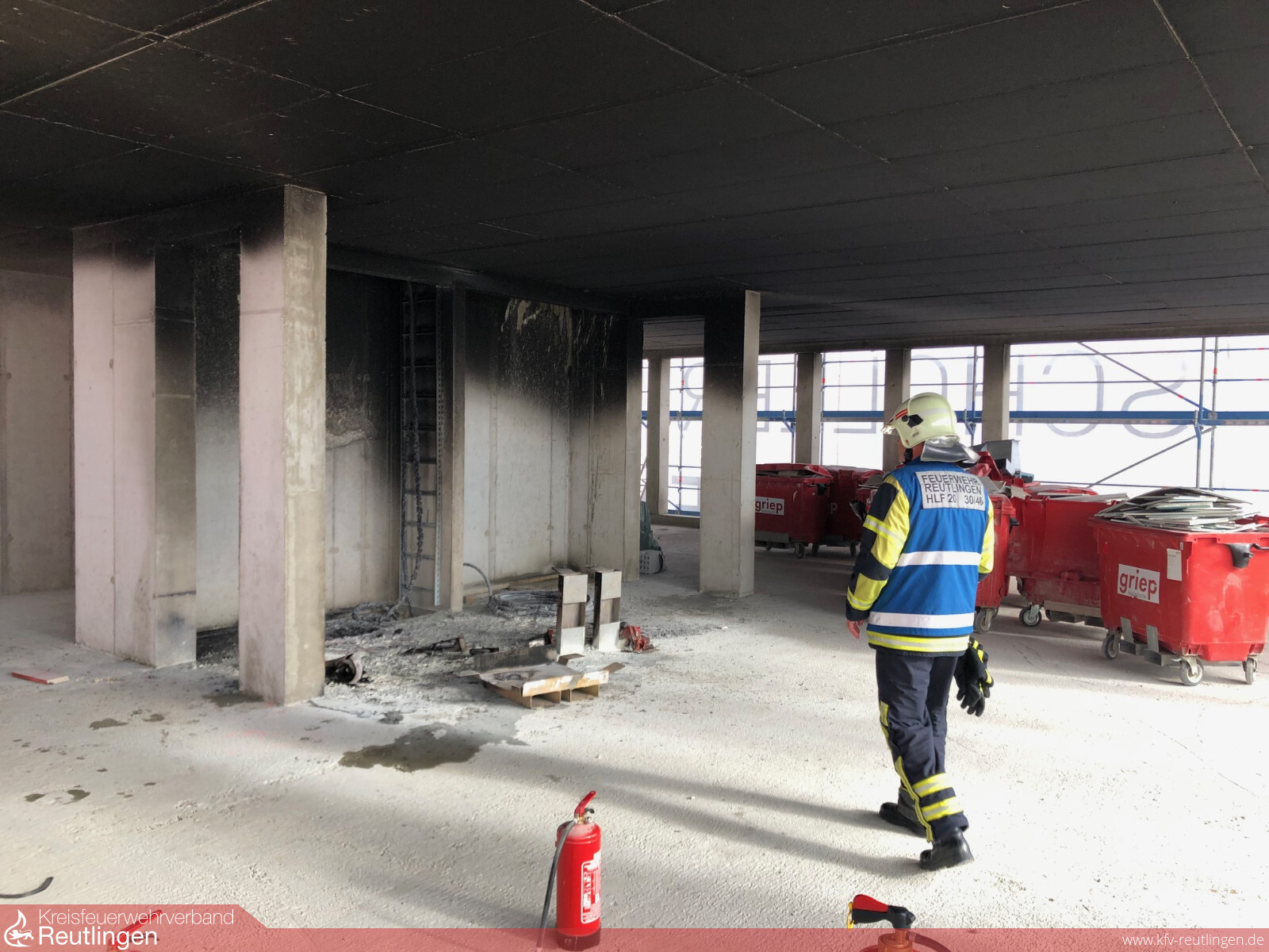 Die gut sichtbare Rauchentwicklung bot sich den Einsatzkräften bereits auf der Anfahrt. Beim Eintreffen wurde der Einsatzleitungsdienst der Feuerwehr Reutlingen vom Bauleiter eingewiesen. Die restlichen Bauarbeiter hatten bereits die Baustelle verlassen und sich auf der gegenüberliegenden Seite gesammelt. Der Bauleiter berichtete von einem Brand zweier Abfallbehälter im 13. Obergeschoss. Darüber hinaus berichtet er von einem Mitarbeiter im 13. OG der das Feuer mit einem Feuerlöscher bereits bekämpft hatte. Zu diesem Zeitpunkt hatte die Rauchentwicklung bereits deutlichen nachgelassen, die Löschmaßnahmen zeigten Wirkung.