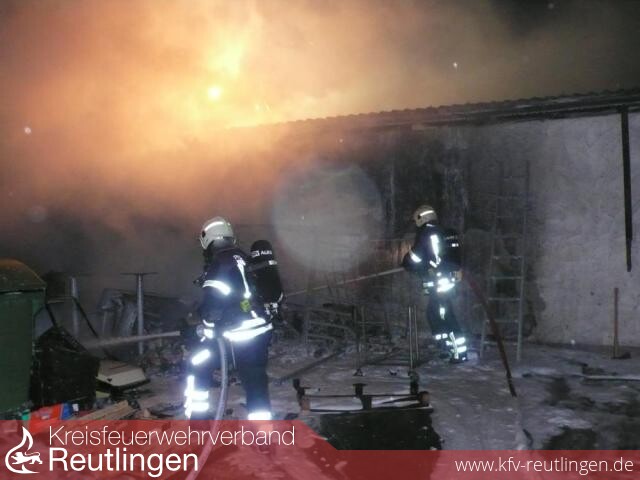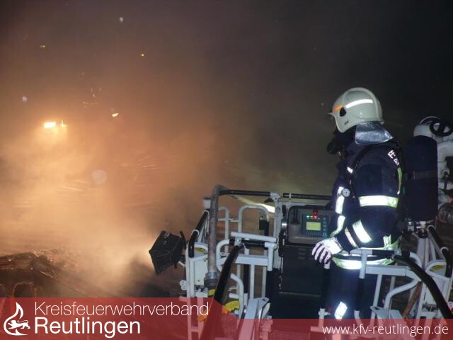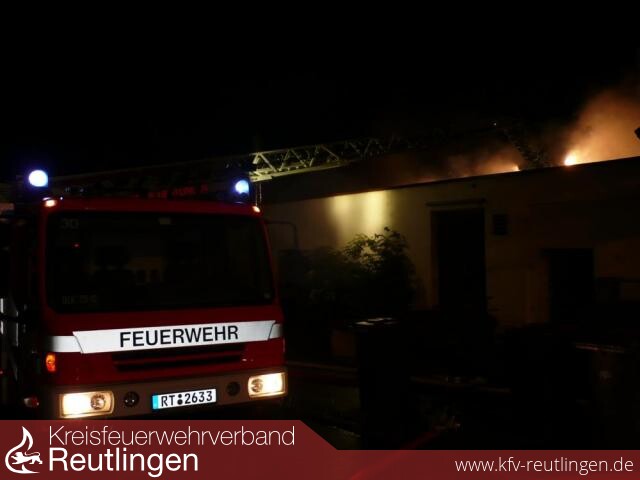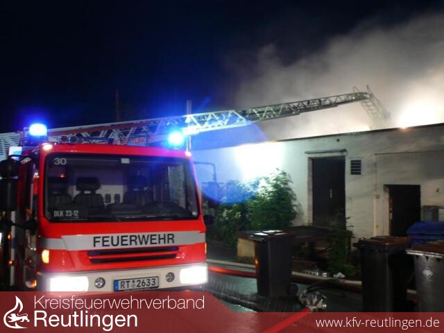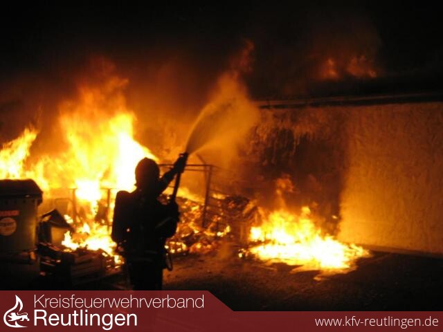 Am frühen Sonntagmorgen wurde die Reutlinger Feuerwehr in die Südstadt gerufen. Anwohner in der Ringelbachstraße wurden gegen 04.20 Uhr von berstendem Eternit, das knallähnliche Geräusche verursachte, geweckt. Rund 10 m hohe Flammen und die lautem Knallgeräusche führten zu einer Vielzahl von Notrufen in der Integrierten Leitstelle.