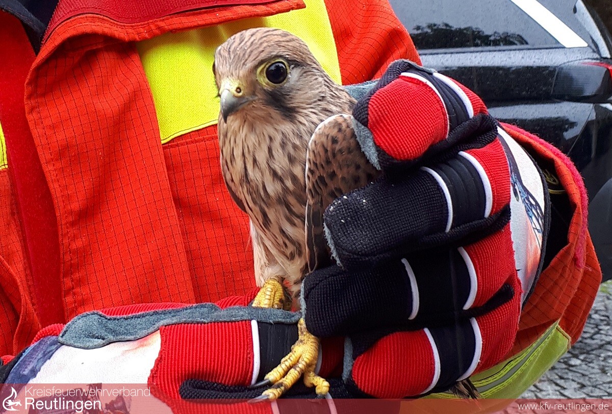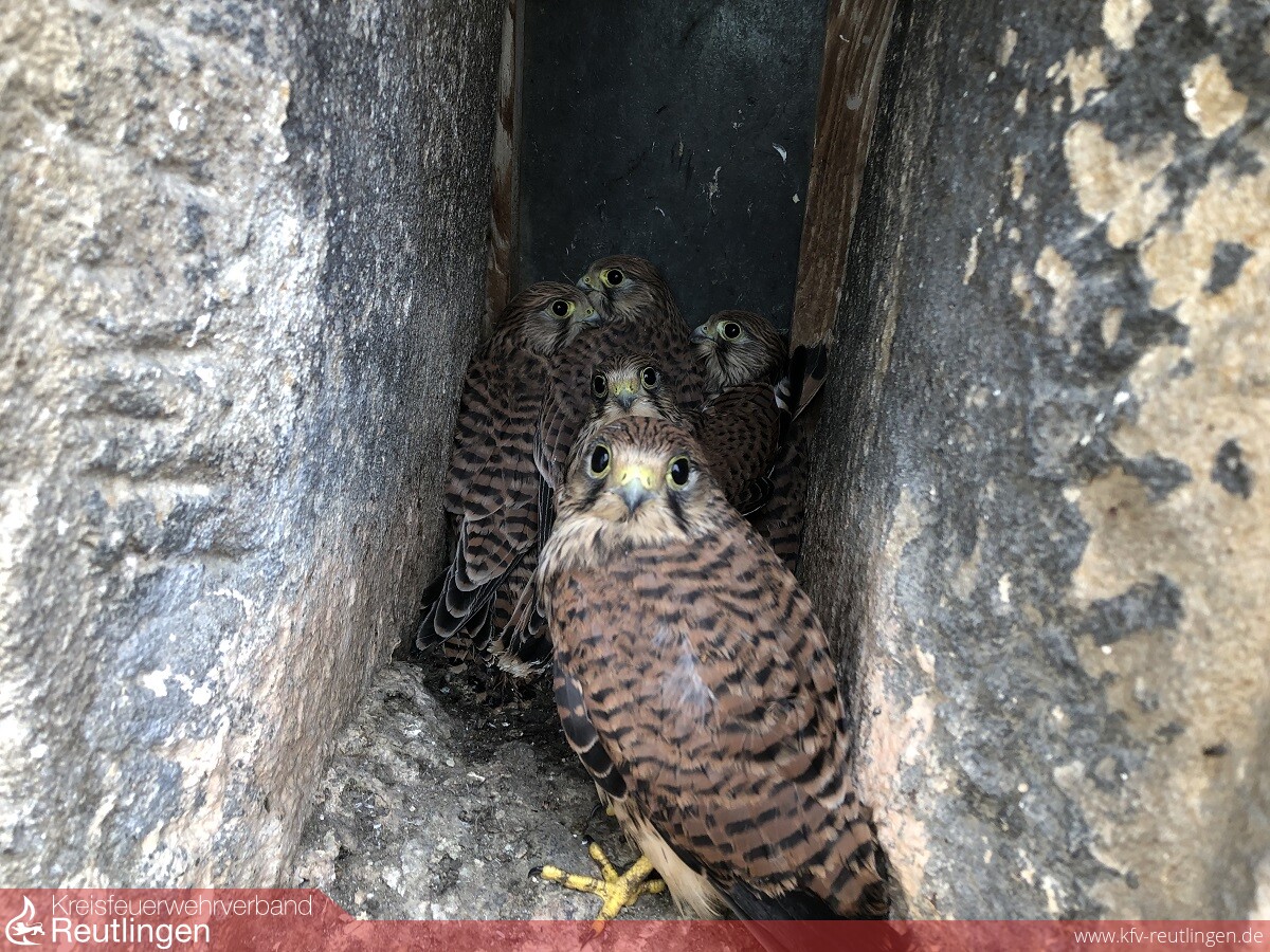 Mit Katzen, die auf dem Dach oder einem Baum sitzen und sich nicht mehr heruntertrauen, hat es die Feuerwehr immer wieder zu tun. Doch recht außergewöhnlich war dagegen ein tierischer Einsatz für die Metzinger Wehr am Freitag. Zur Mittagszeit hat Passanten von einem offensichtlich verletzten Vogel berichtet. Vor Ort stellte sich heraus, dass es sich um einen jungen Falken gehandelt hat, der ganz offensichtlich aus seinem Nest gefallen war. Ein Greifvogel-Experte gab den uniformierten Brandschützern schließlich den Tipp, den Vogel wieder in sein Nest zu setzen. Das war gar nicht so einfach, befand sich das doch in einer Nische der Martinskirche in rund 15 Meter Höhe. Nachdem der verschüchterte Vogel eingefangen war, ging es in der Obhut von zwei Feuerwehrleuten im Korb der Drehleiter zurück zu der aufgeregten Mama und den vier Geschwistern im luftigen Nest. Dort dürfte der junge Greifvogel wohl erst noch einmal Flugstunden bei der Vogelmama gebuch.