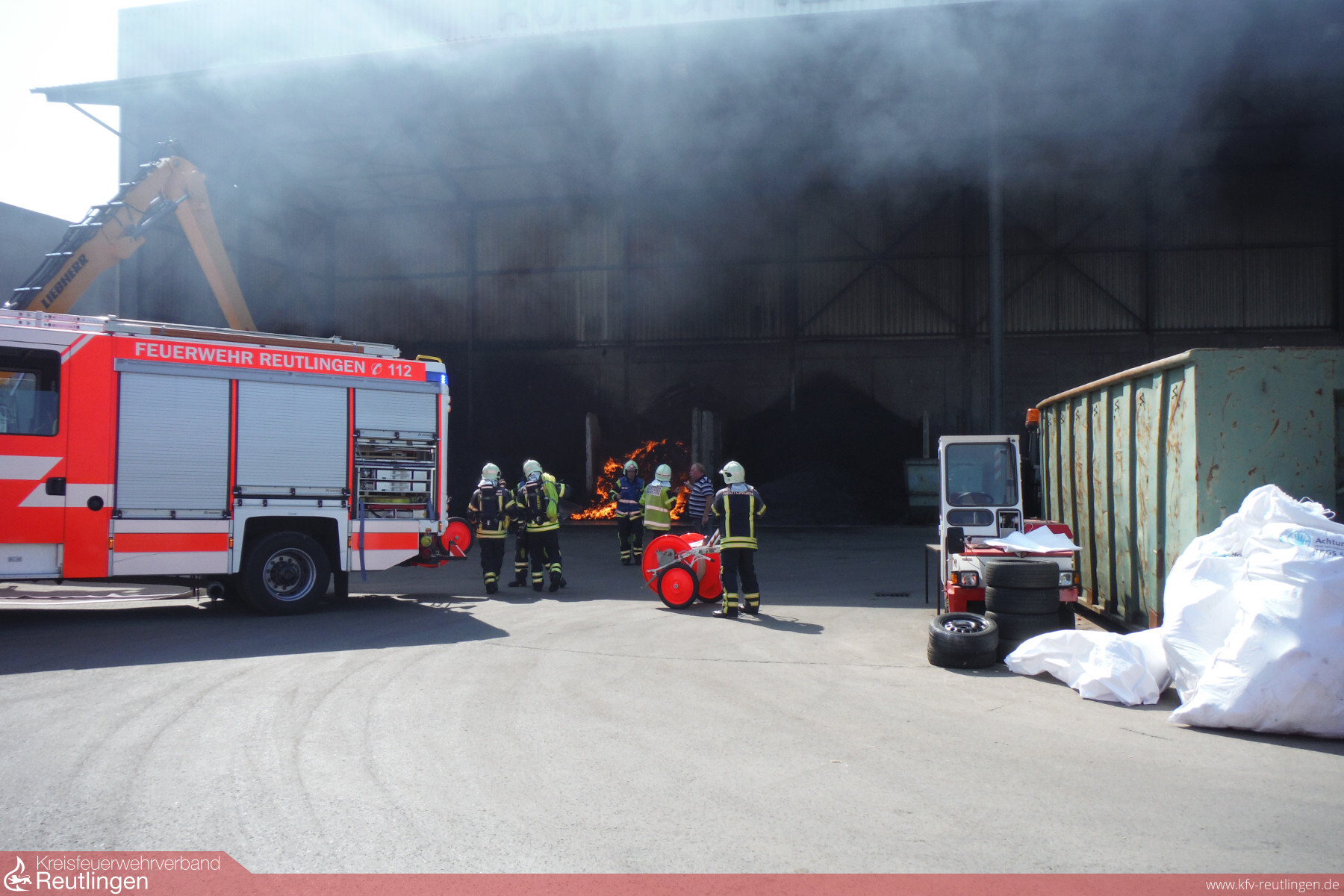 Beim Eintreffen an der Einsatzstelle bot sich den Einsatzkräften folgendes Bild. In einer einseitig offenen Lagerhalle für metallisches Schüttgut brannte in einer Lagerbox mit ca. 2,50m Breite und 5,00m Länge ca. 2,00m hoch eingelagerter Schleifschlamm. Das Feuer hatte bereits die gesamte Oberfläche des Lagerguts erfasst.