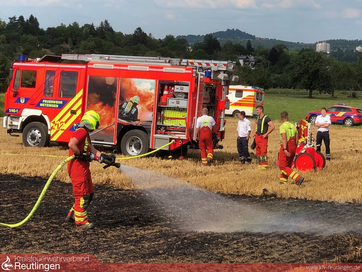 Aus bislang unbekannter Ursache ist am gestrigen Sonntag ein abgeerntetes Feld in der Nähe der Baumschule Handel in Brand geraten. Gegen 16 Uhr waren mehrere Notrufe bei der Leitstelle für Feuerwehr und Rettungsdienst in Reutlingen eingegangen. Noch vor Eintreffen der Feuerwehr versuchte ein Nachbar, das Feuer mit mehreren Feuerlöschern einzudämmen. Dennoch zeigte eine große Rauchsäule den Einsatzkräften den Weg links der Landesstraße Richtung Reicheneck bei der früheren Hühnerfarm. Den Einsatzkräften der Feuerwehr gelang es, das Feuer einzudämmen und schließlich abzulöschen. Insgesamt brannte eine Fläche von rund 500 Quadratmeter. Nach Auskunft der Feuerwehr ist bei der aktuellen trockenen und heißen Witterung die Gefahr von Flächenbränden groß. Eine weggeworfene Zigarettenkippe oder ein Stück Glas, das als Brennglas wirken kann, reichen als Zündquelle aus. Am Wochenende hatte die Feuerwehr außerdem noch mit einer ganz anderen Gefahrenlage zu tun: Am Freitag war ein kleines Kind in ein Wespennest getreten und im Anschluss von rund 50 der aufgeschreckten Insekten gestochen worden. Die First-Responder der Feuerwehr leiteten bei dem verletzten Kind die Erstmaßnahmen bis zum Eintreffen des Notarztes ein. Im Anschluss kümmerte sich die Feuerwehr um die Absperrung der Einsatzstelle im Neugreuth und die Beseitigung des Erdwespennestes.