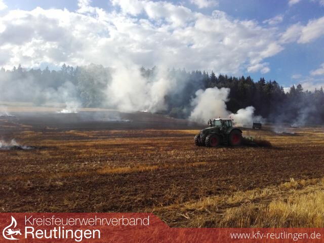 Zu einem Flächenbrand wurde die Freiwillige Feuerwehr Zwiefalten am Montagnachmittag alarmiert. An einem ca. 5 ha großen Feld, zwischen Zwiefalten-Gauingen und Wimsen, war ein Lohnunternehmer damit beschäftig Stroh zu pressen. Plötzich bemerkte er Rauch und Funken, welche aus der Presse kamen. Mit einem dazugekommenen Helfer versuchte er das Stoh aus der Presse zu bekommen, dabei fing dies aber dann richtig an zu brennen. Geistesgegenwärtig ruf der die Feuerwehr und hängte die Presse ab.