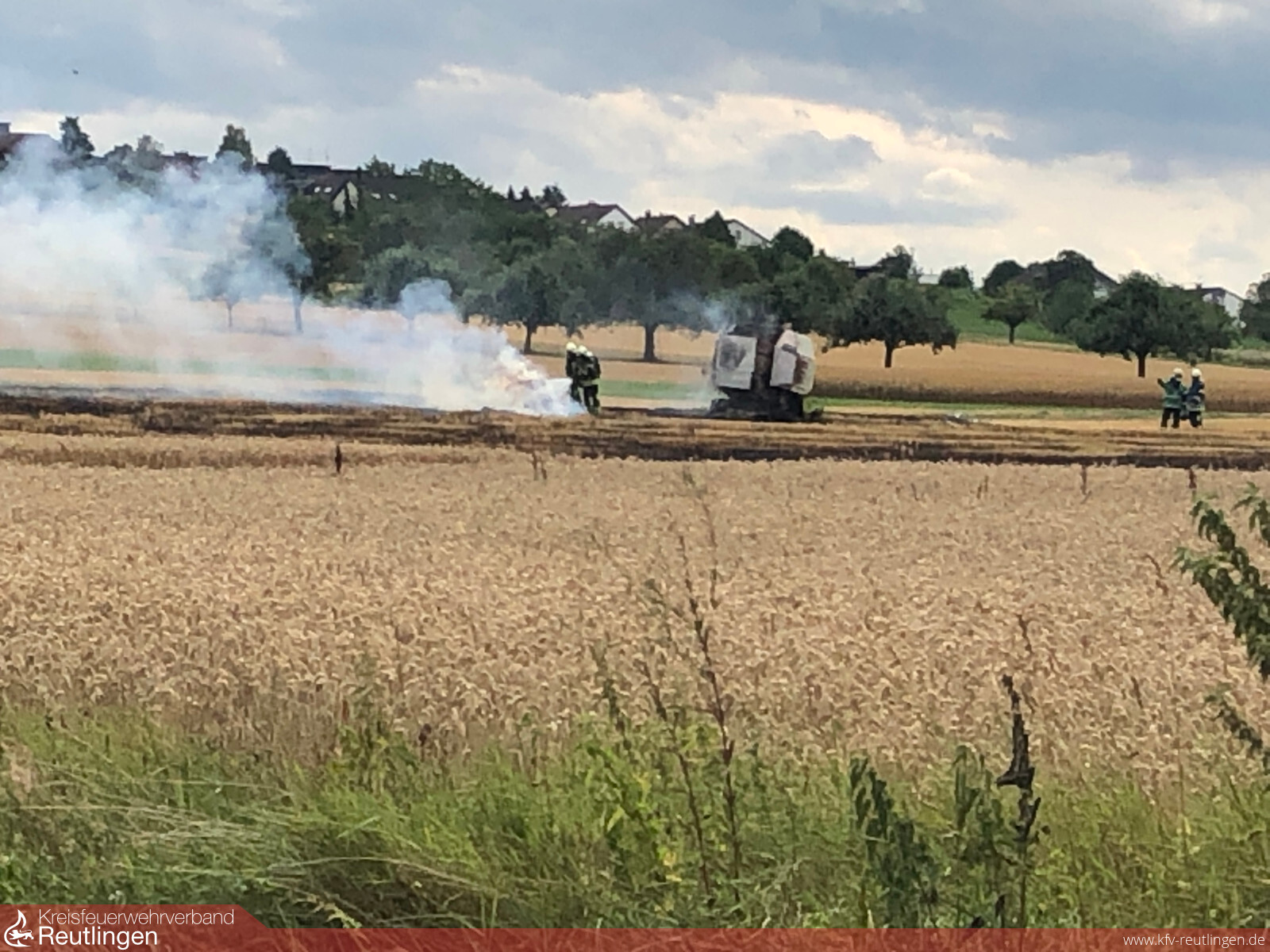 Die Feuerwehr bekämpfte den Flächenbrand mit mehreren Rohren von allen Seiten und konnte dies so rasch unter Kontrolle bringen. Das Feuer wurde nur wenige Meter vor einem Turm aus gepressten Ballen gestoppt. Nachdem die Flammen gestoppt waren, wurde deutlich, dass ein ca. 800-900 m² große Fläche abgebrannt ist. Zu großen Teilen war die Fläche bereits abgeerntet, lediglich ein kleinerer Teil der Ernte ist den Flammen zum Opfer gefallen. Aufgrund der großen Ausbreitung wurde noch ein Löschfahrzeug der nahegelegenen Freiwilligen Feuerwehr Abteilung Rommelsbach hinzugezogen.